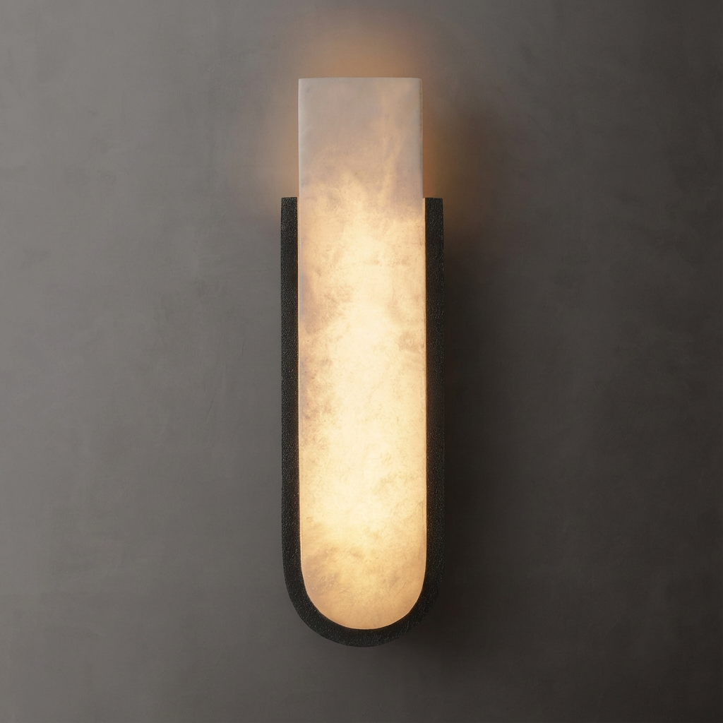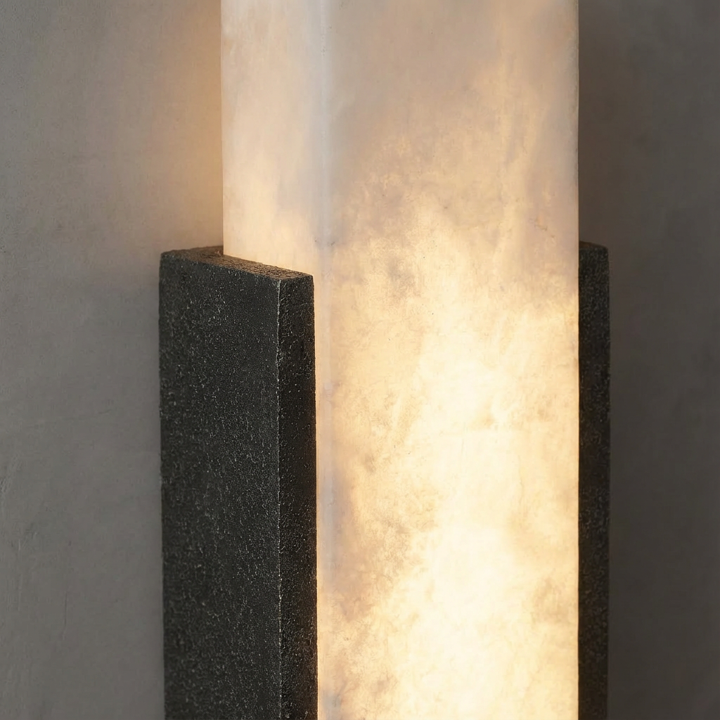 Introducing the Gideon Alabaster Sconce - a compact wall light defined by its precise, architectural edges and refined presence. Crafted in alabaster, it offers a soft, luminous glow that feels both modern and timeless. When lit, the natural stone gently washes light upward and downward, creating a calm, vertical lighting gesture along the wall. The effect is understated yet elevated, adding quiet sophistication to any setting. Ideal for modern hallways, refined bedrooms, or transitional spaces, the Gideon Alabaster Sconce brings subtle, ambient illumination with a warm, sculptural character.