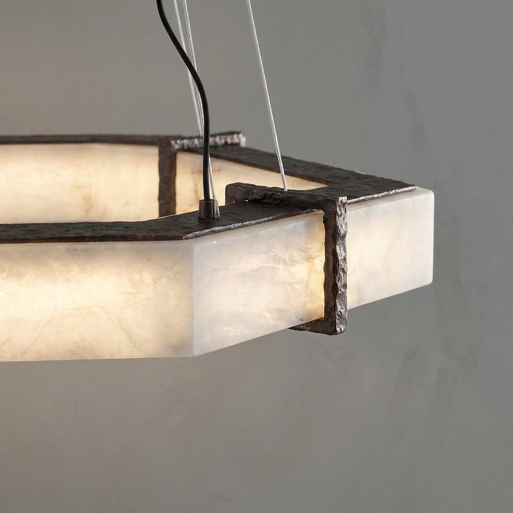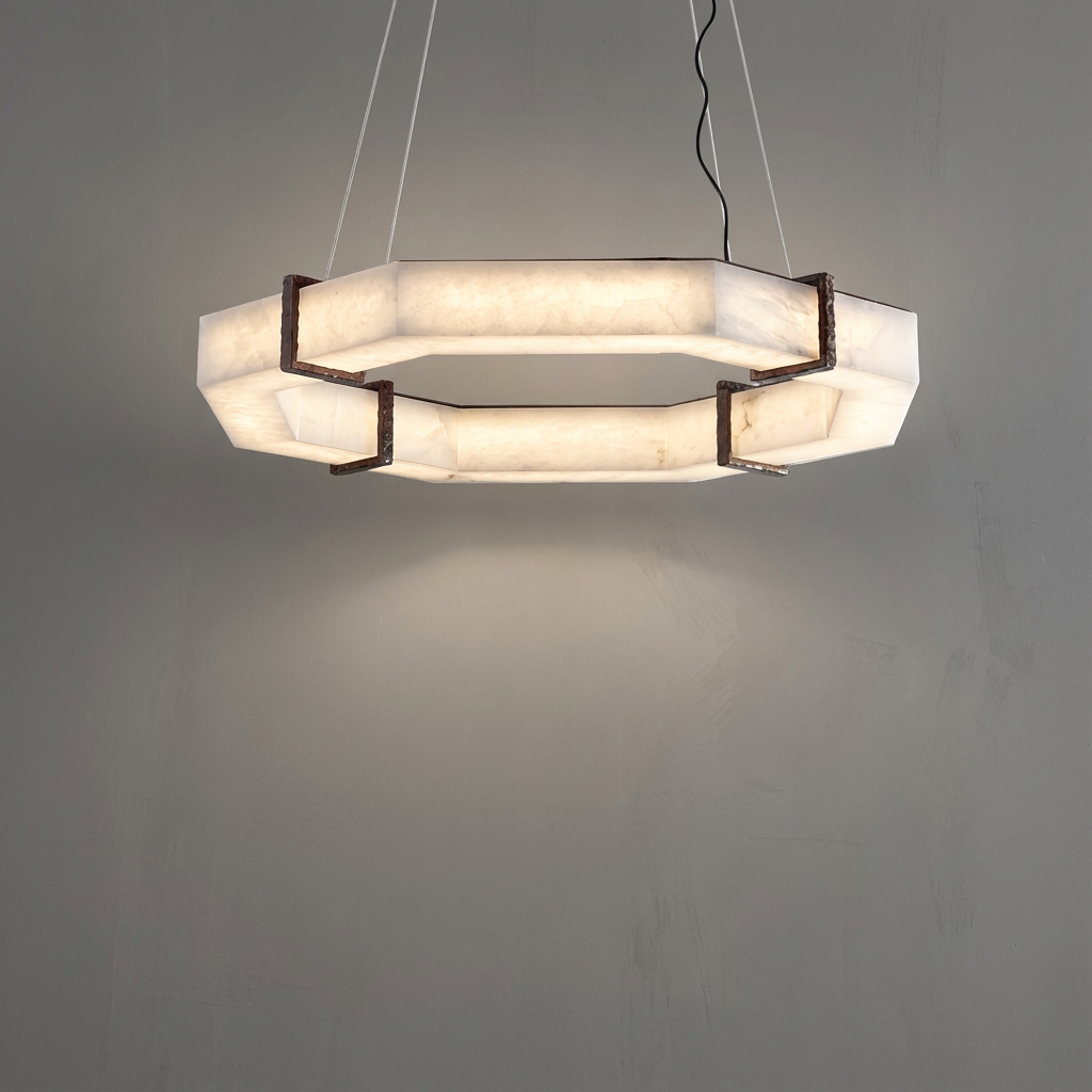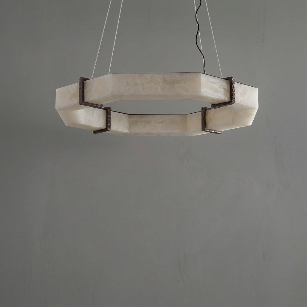 Introducing the Belos Alabaster Chandelier - a sculptural statement piece composed of rounded alabaster forms that recall polished river stones. Each element showcases the natural beauty of alabaster, with mineral veins that come alive under a gentle, organic glow. As the light shifts across the stone, it creates a remarkably soft, atmospheric illumination that feels both modern and timeless. The overall effect is quietly dramatic, making this chandelier an ideal focal point for contemporary living rooms, artistic dining areas, or nature‑inspired interiors. Thoughtfully designed to feel collected and curated rather than overtly decorative, the Belos Alabaster Chandelier brings an elegantly understated presence to any space, elevating the room with its refined materiality and sculptural form.