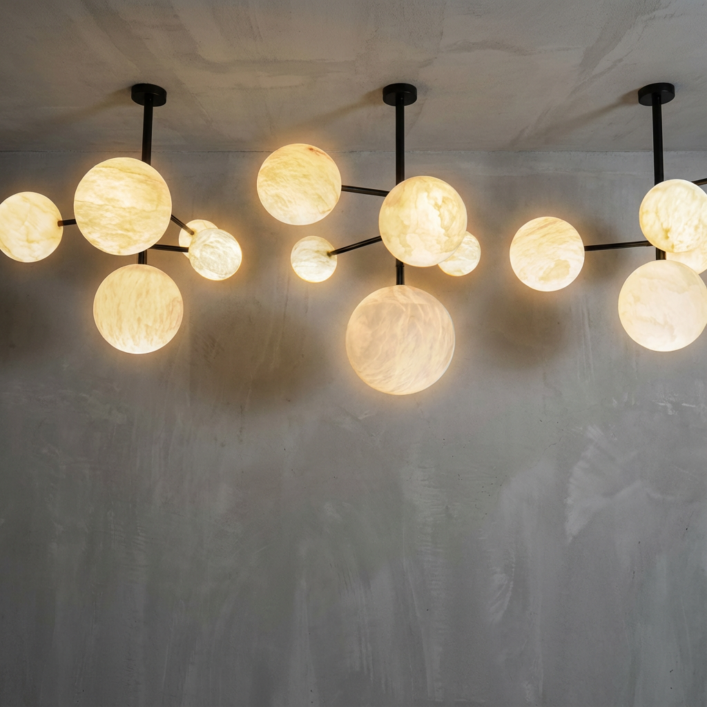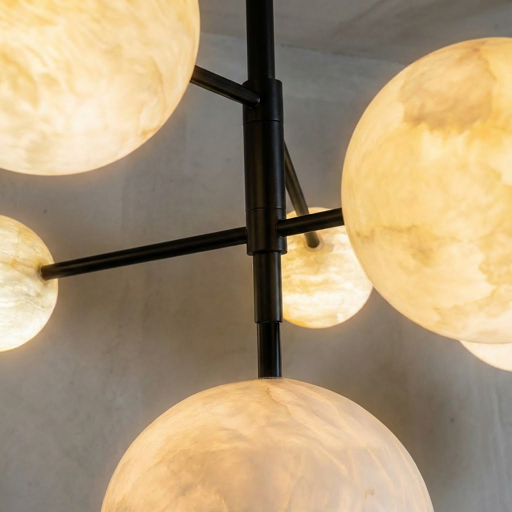 Sculpted as a constellation of smooth alabaster spheres, the Carol Sphere Delight Modern Artistic Alabaster Chandelier Light hangs like a suspended piece of modern art. Light moves slowly through each orb, revealing feathered mineral veining and a warm, atmospheric glow that expands gently into the room. Ideal for contemporary dining spaces, high-end foyers, and artistic living rooms, it brings together natural stone and sculptural geometry to define a refined, modern aesthetic. This chandelier emphasizes material authenticity and the quiet luxury of natural stone lighting. Its alabaster (or calcite) surfaces enrich biophilic interiors and pair beautifully with wood, brass, bronze, concrete, and soft textiles. The handcrafted diffuser ensures the stone's veining remains visible from multiple angles, so every installation feels unique, tactile, and connected to nature. With its calm radiance and soft ambient spread, the Carol Sphere Delight Chandelier flatters modern organic settings, Scandinavian-inspired environments, luxury hospitality spaces, and transitional homes seeking sculptural lighting with subtle emotional warmth. It elevates dining areas, open living rooms, curated hallways, staircases, and boutique commercial interiors with a sense of refined architectural balance.