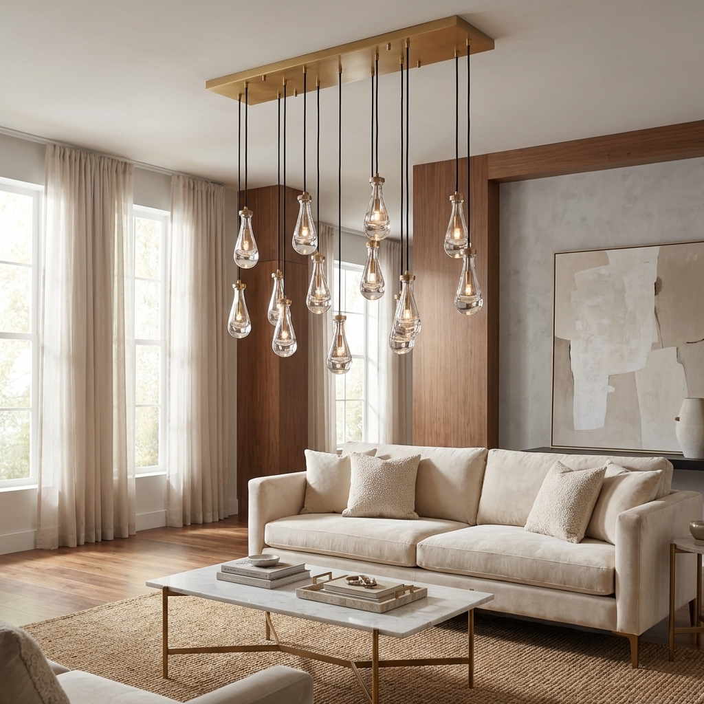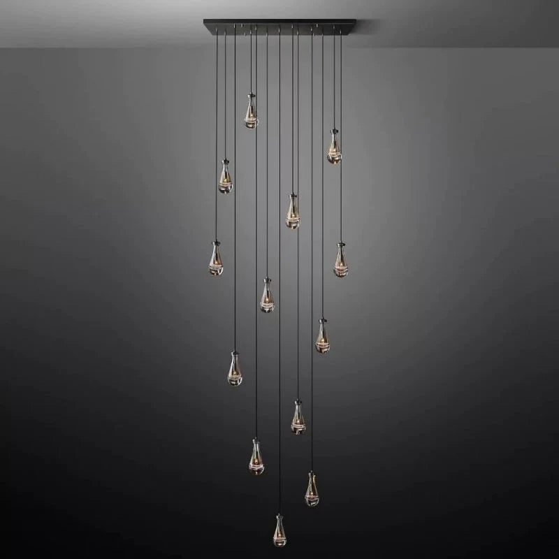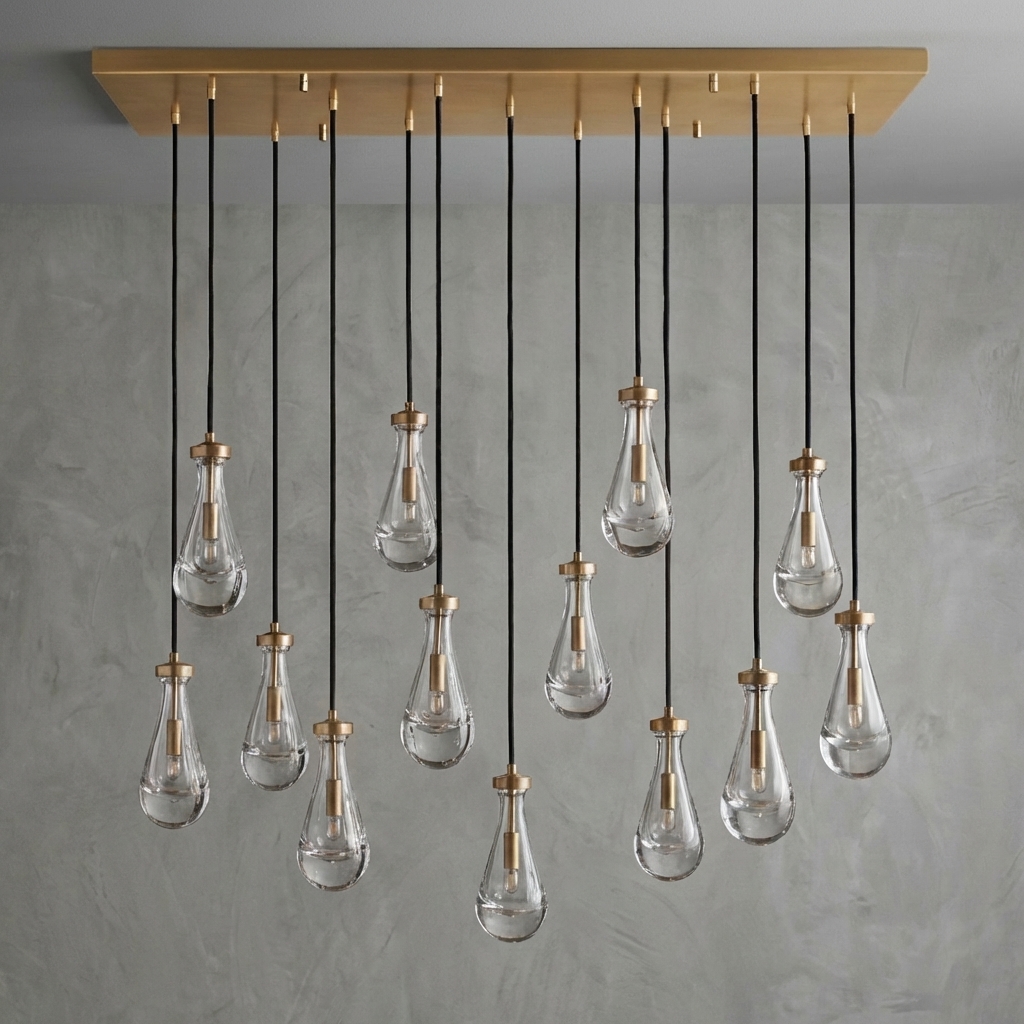 - Style / Visual Character: Organic teardrop blown glass pendants in a linear chandelier arrangement