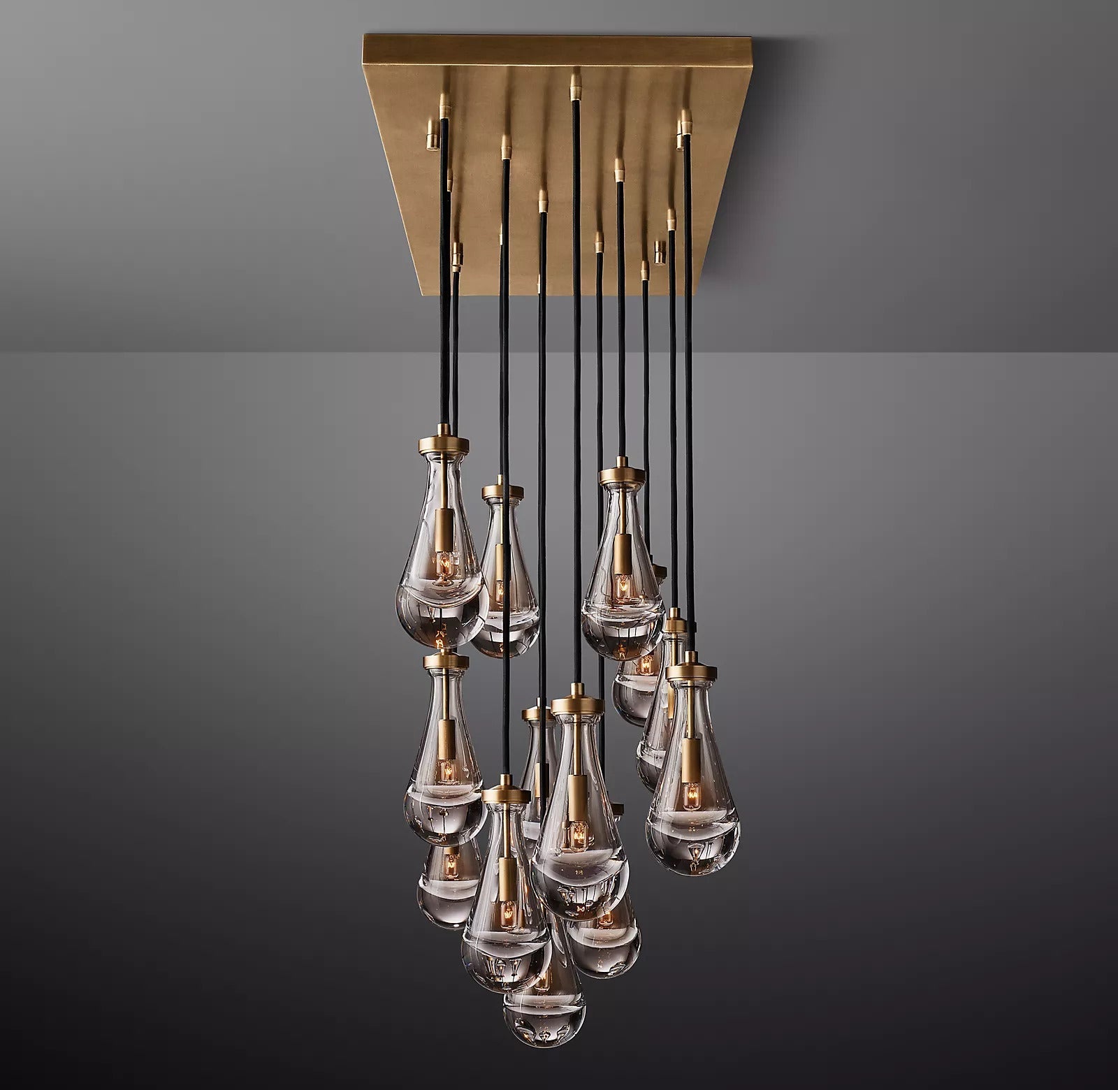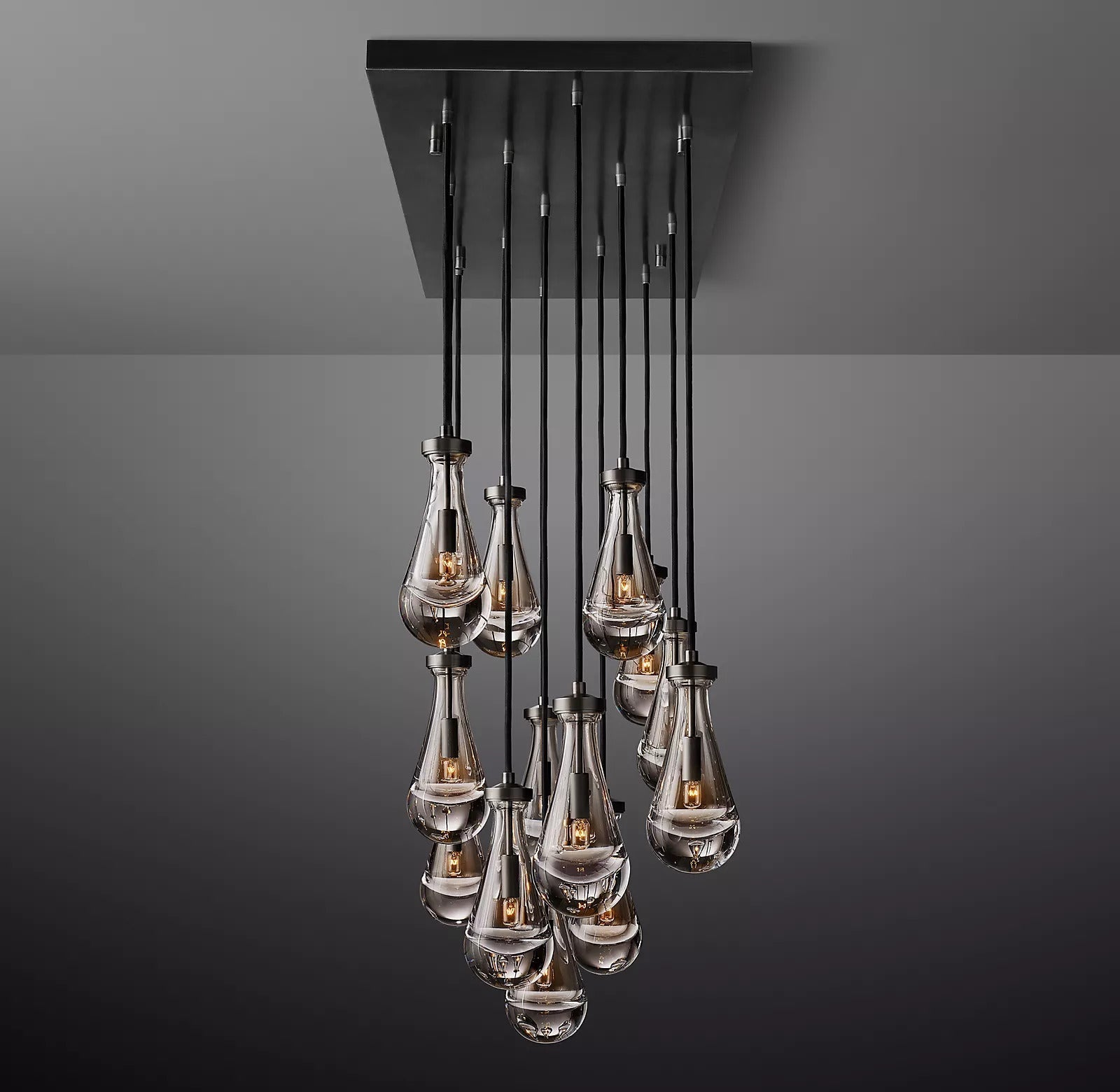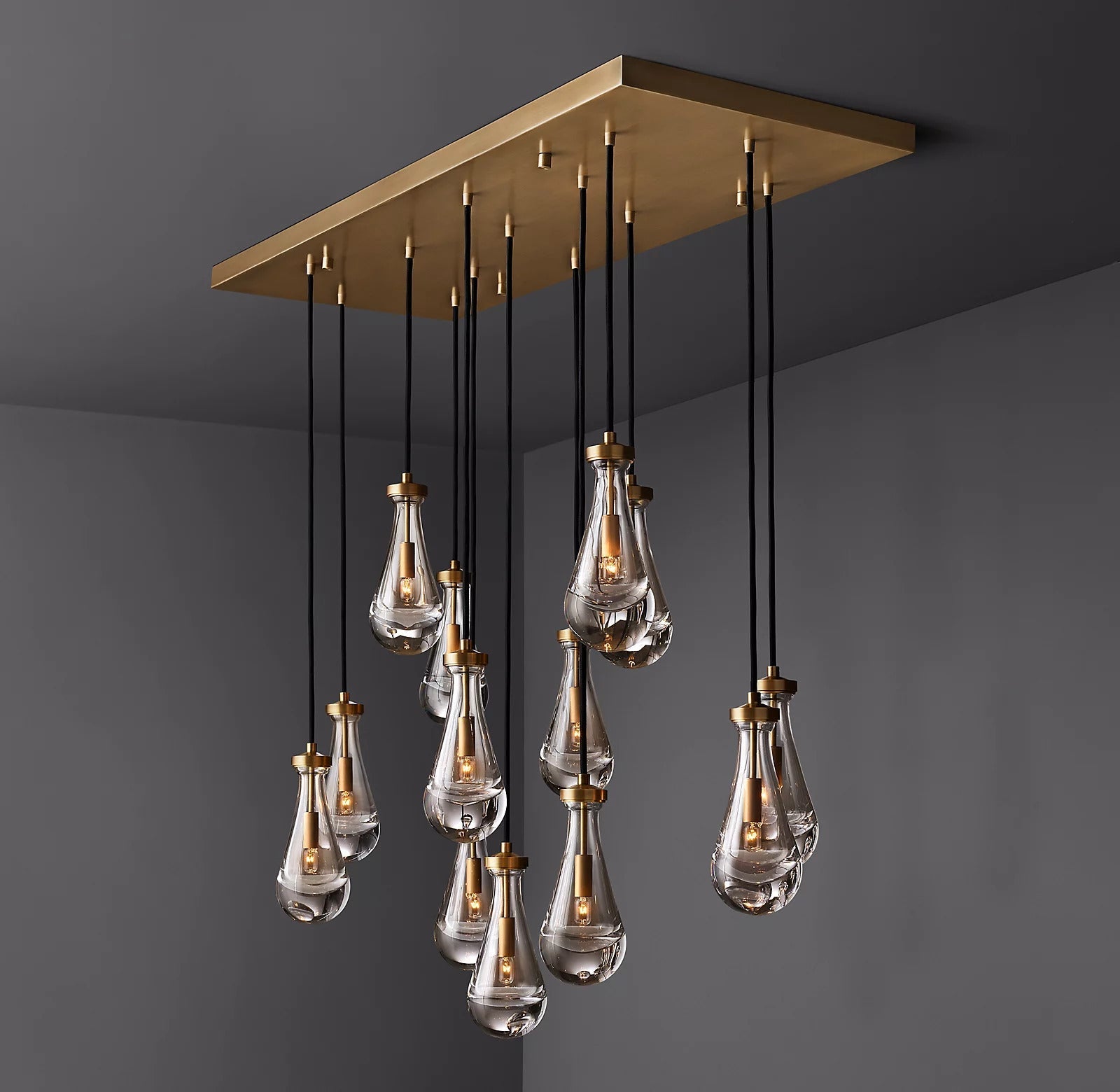- Style / Visual Character: Organic teardrop blown glass pendants in a linear chandelier arrangement