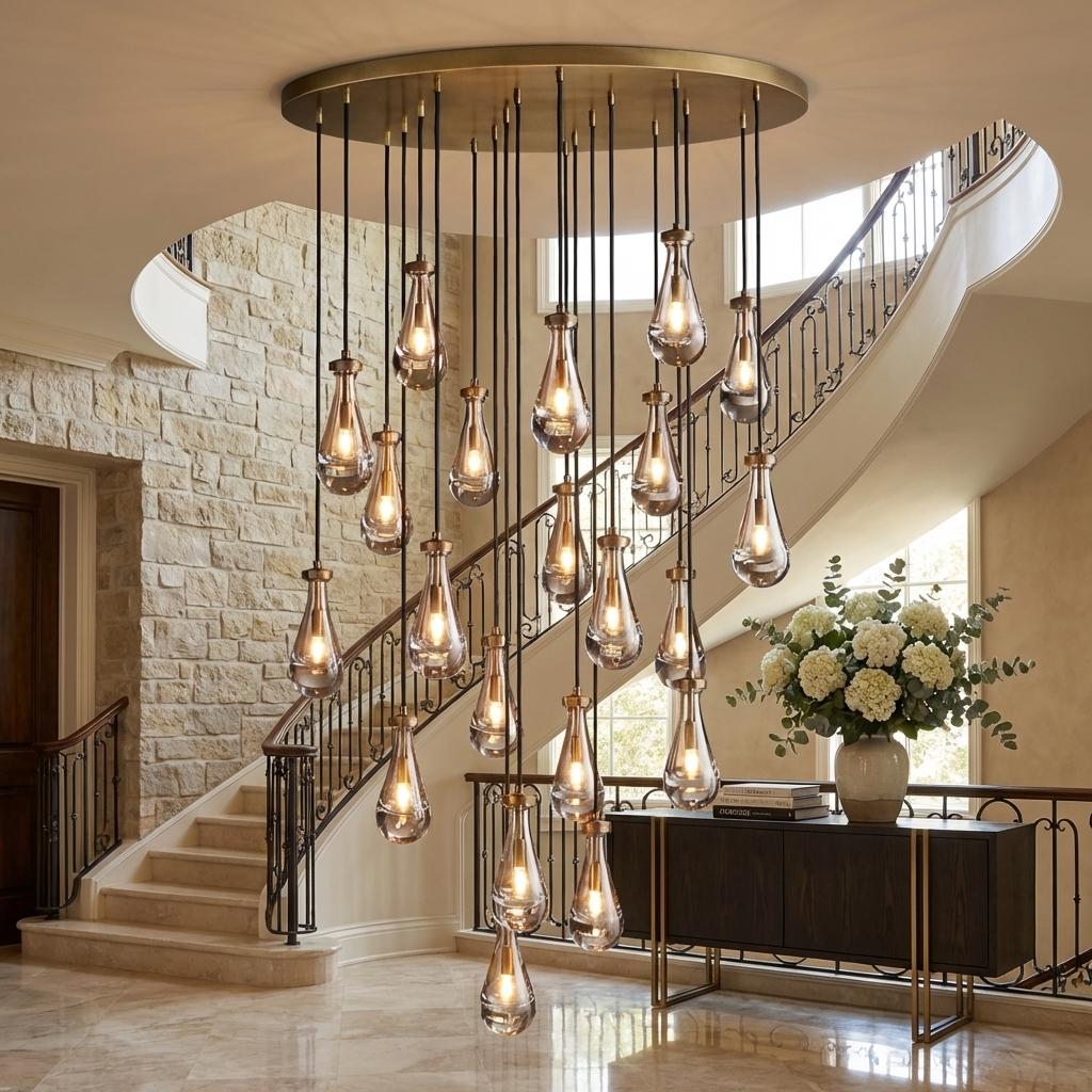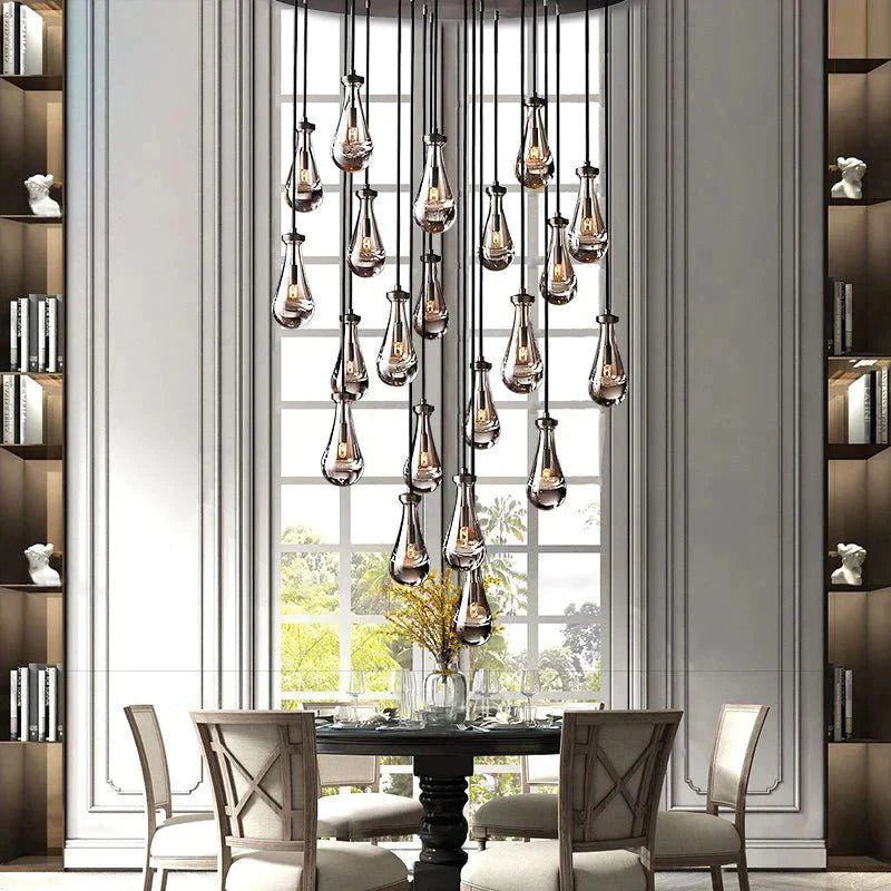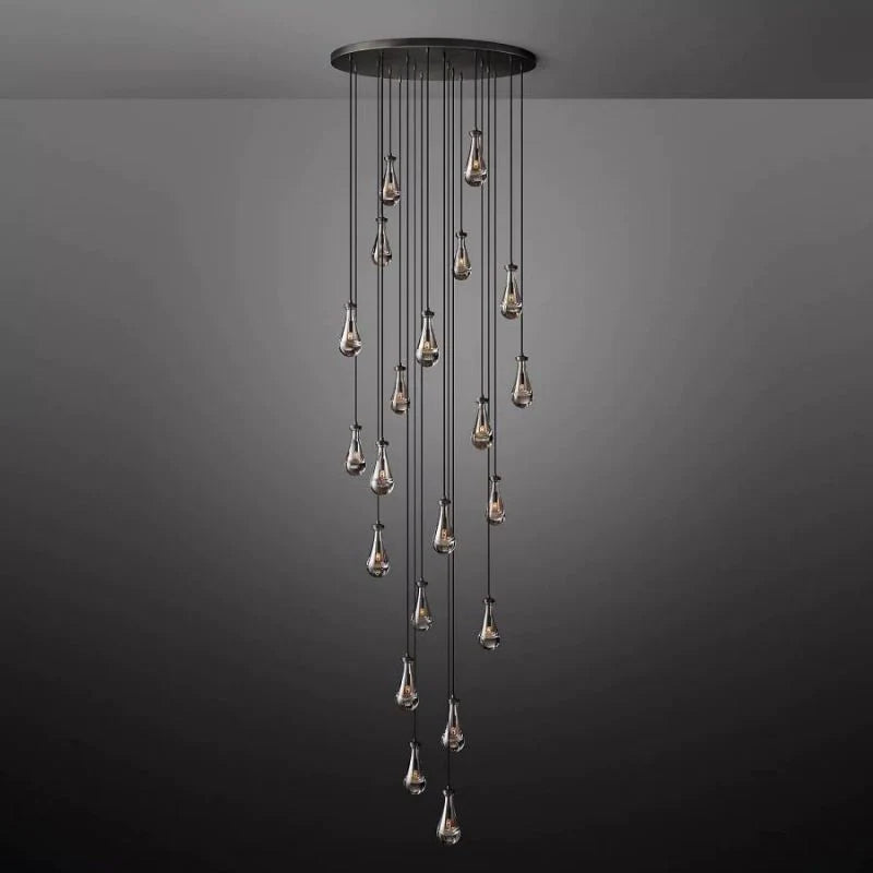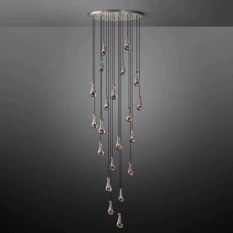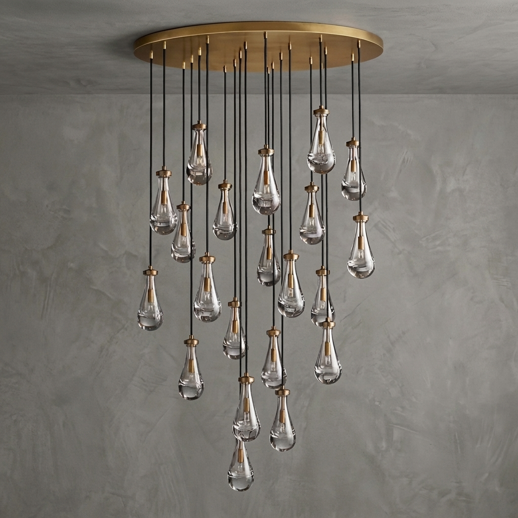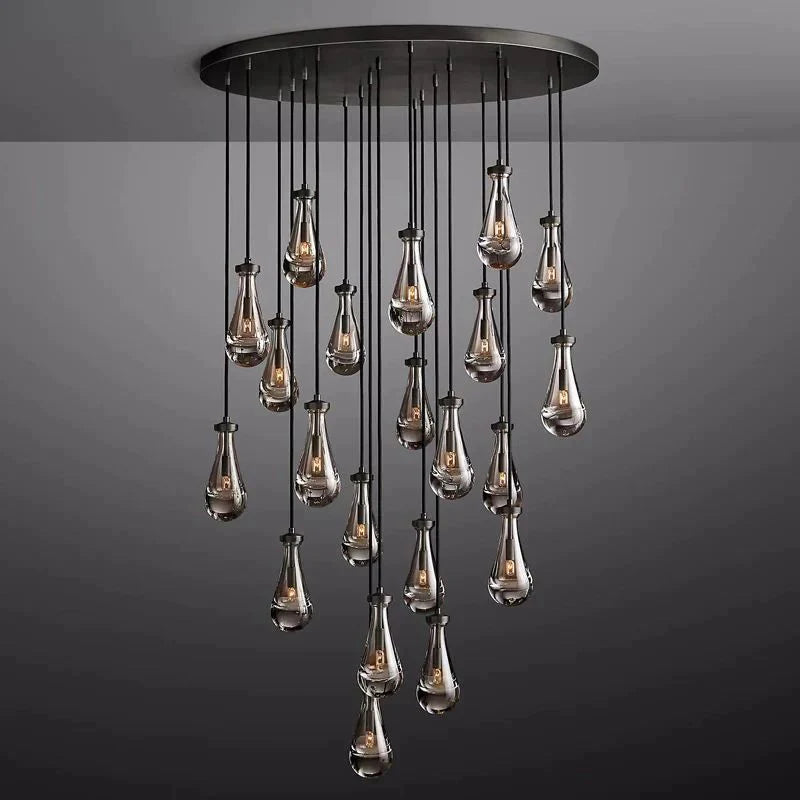 The Goccia Round Chandelier 47" is ideal for interiors seeking a statement fixture with natural rhythm and luminous texture. Its teardrop glass composition creates an ever-changing impression of expansion and compression, echoing the movement of rainfall while casting warm ripples of light across surrounding surfaces.