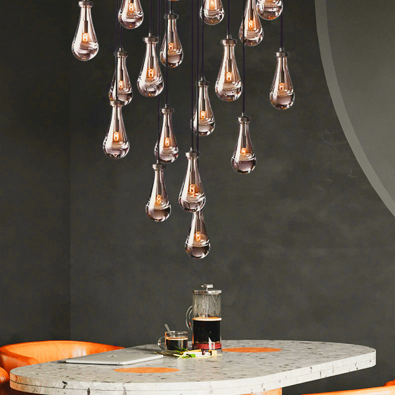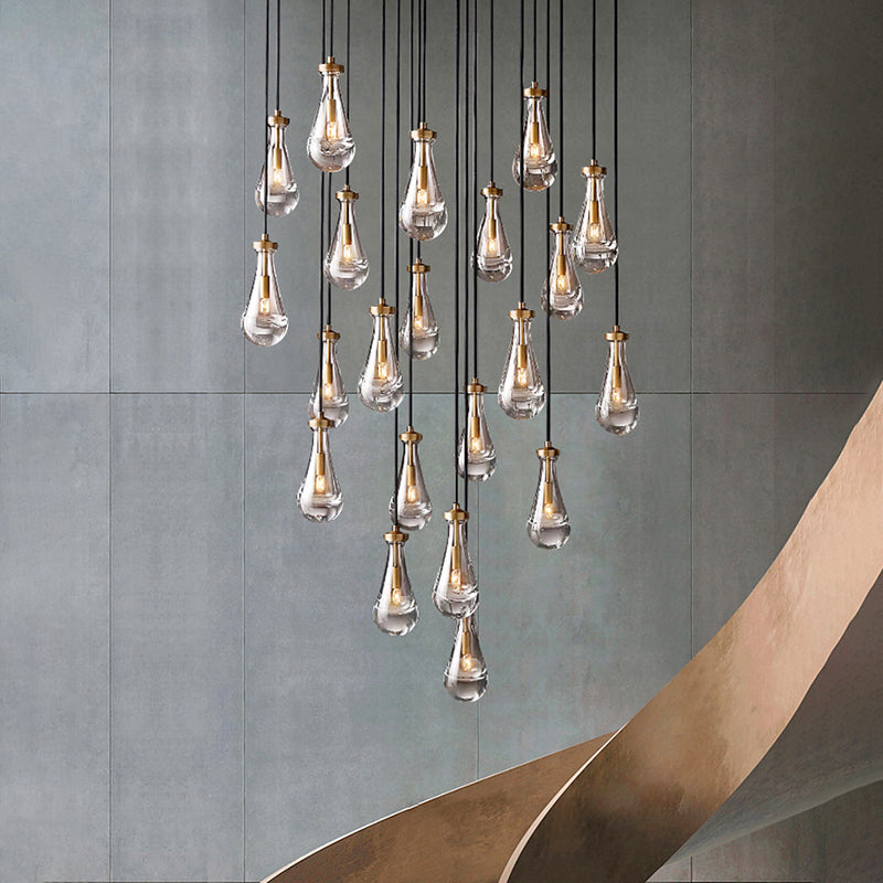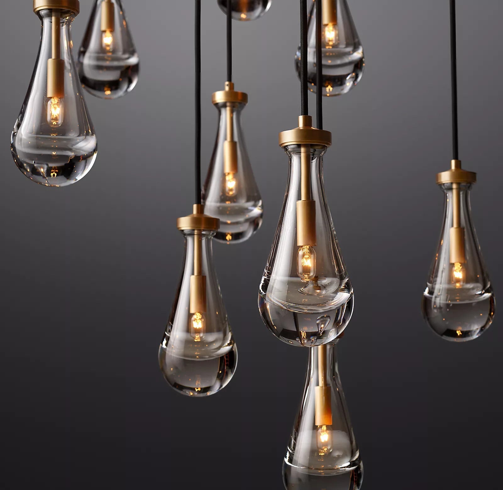 The Goccia Round Chandelier 47" brings a sculptural, rain-inspired presence to the room with luminous teardrop blown glass suspended from a wide round canopy. Organic glass drops encase the bulbs to create a soft underwater glow, while the clustered composition adds movement, depth, and a dramatic ceiling statement. Crafted from hand-blown glass and solid brass, this chandelier suits living rooms, dining rooms, bedrooms, villas, and hospitality interiors.