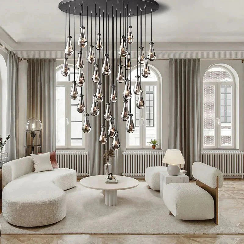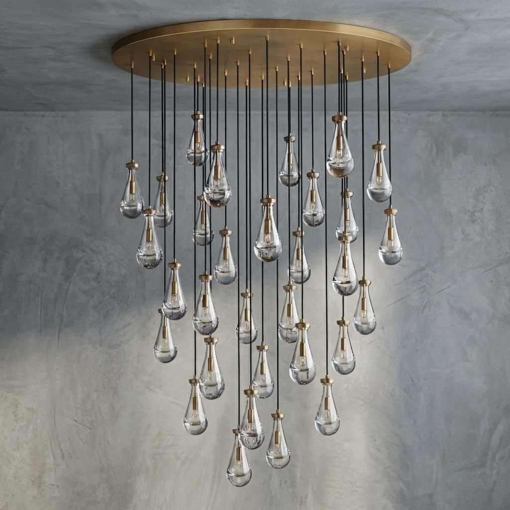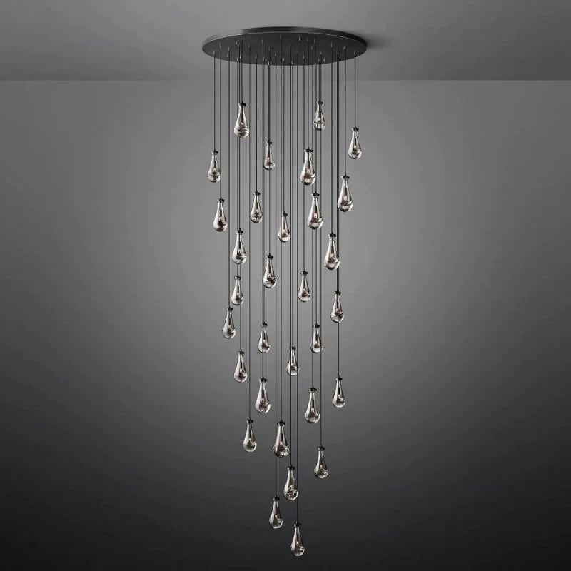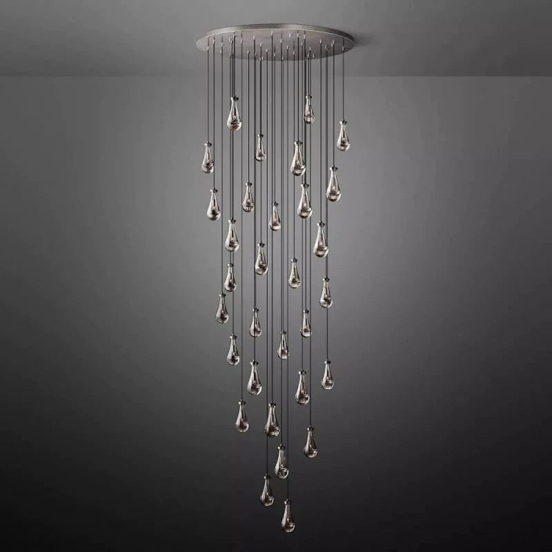 Designed with 31 individual glass drops, the Goccia Round Chandelier 60" offers a striking balance of scale and delicacy. Each teardrop shade wraps the bulb to produce an underwater-like illumination effect, while the round arrangement casts glowing ripples across surrounding walls and ceiling. The adjustable hanging length allows flexibility in composition and installation height, making it suitable for a range of ceiling conditions and room layouts.