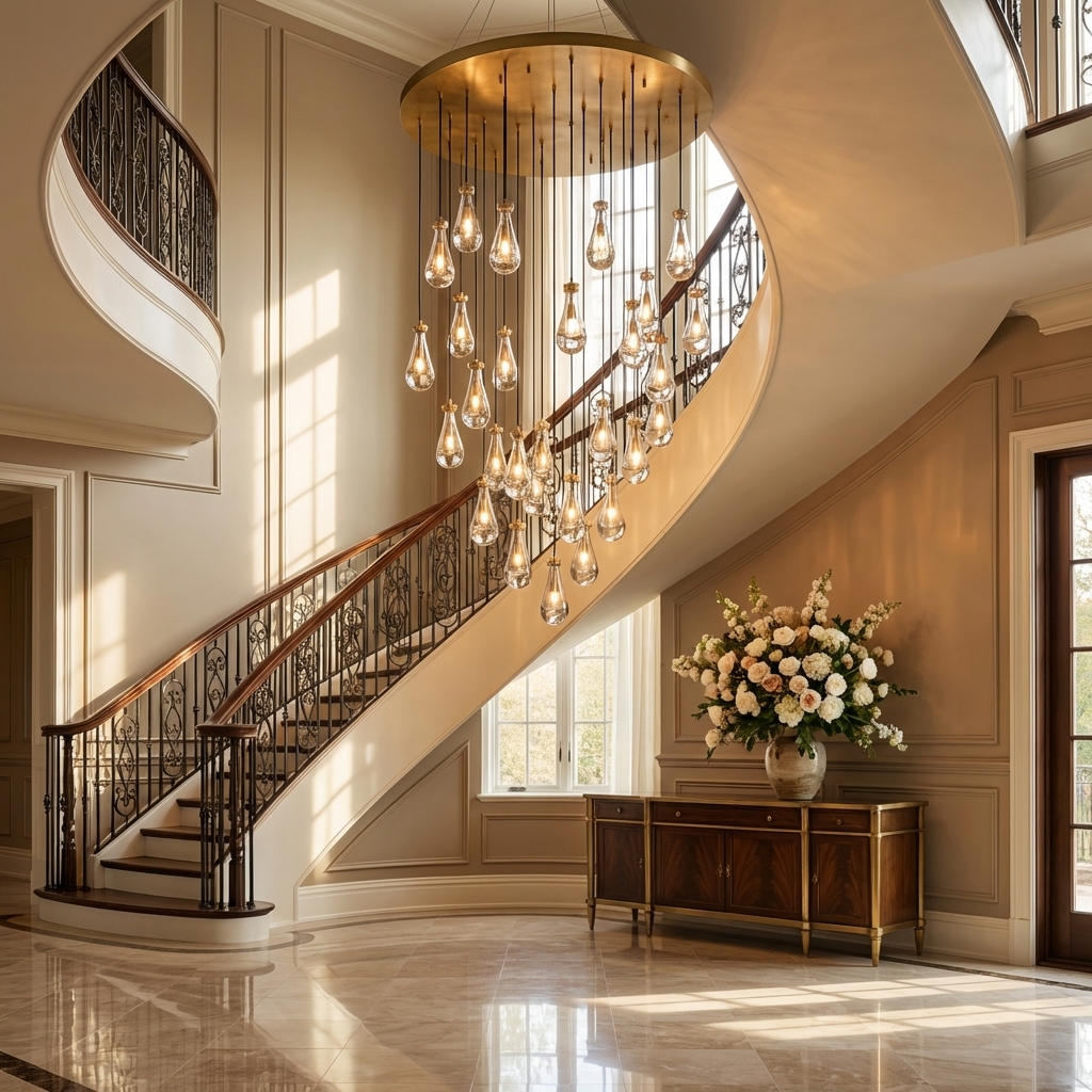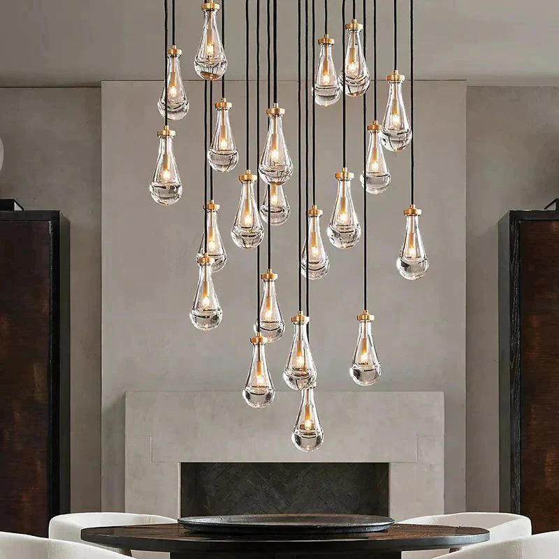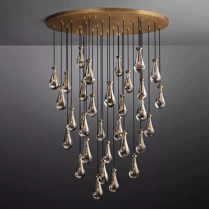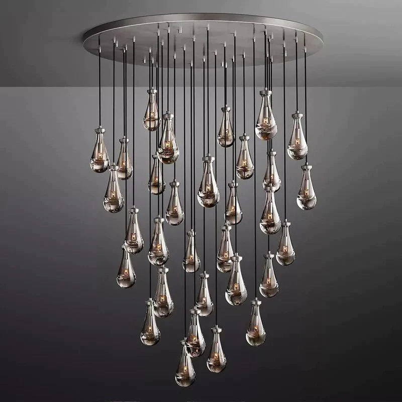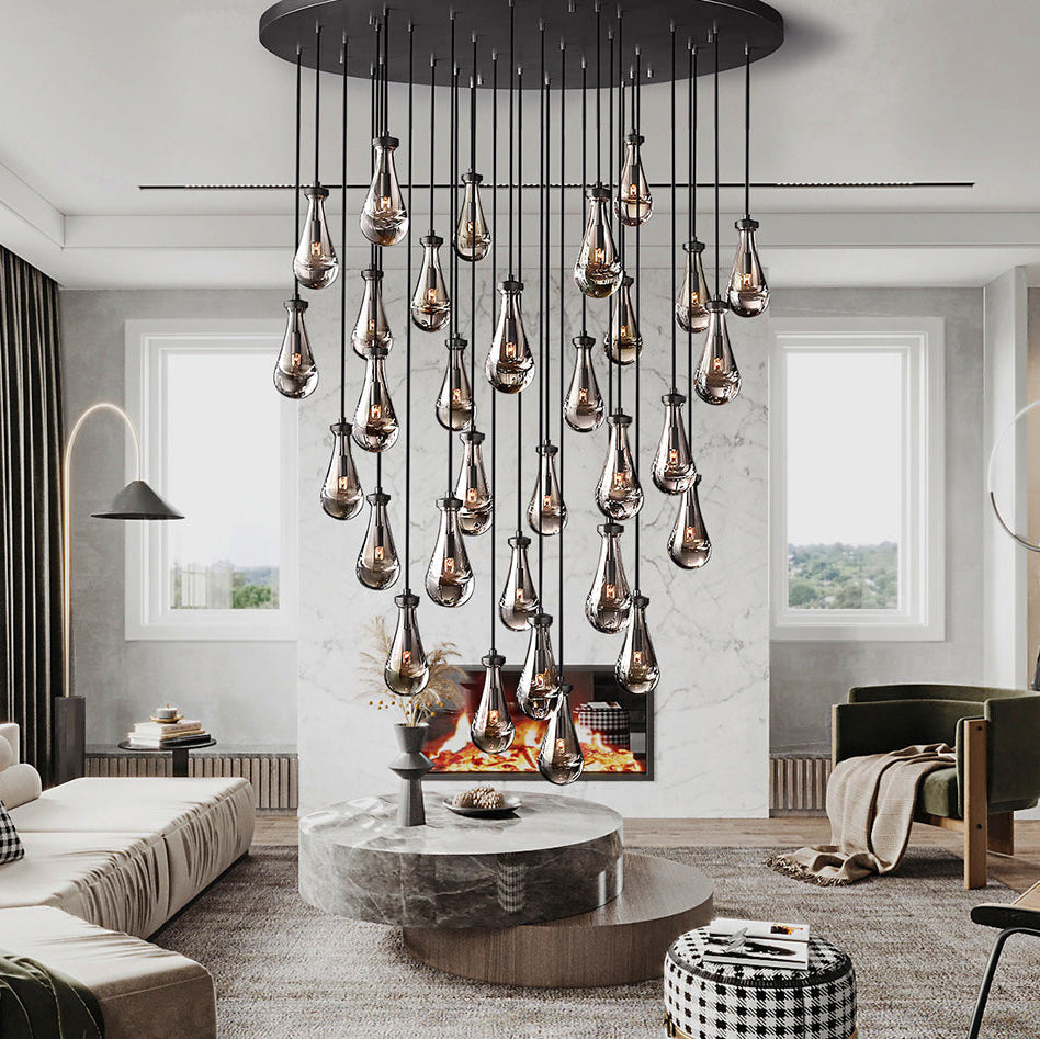 Designed with 31 individual glass drops, the Goccia Round Chandelier 60" offers a striking balance of scale and delicacy. Each teardrop shade wraps the bulb to produce an underwater-like illumination effect, while the round arrangement casts glowing ripples across surrounding walls and ceiling. The adjustable hanging length allows flexibility in composition and installation height, making it suitable for a range of ceiling conditions and room layouts.