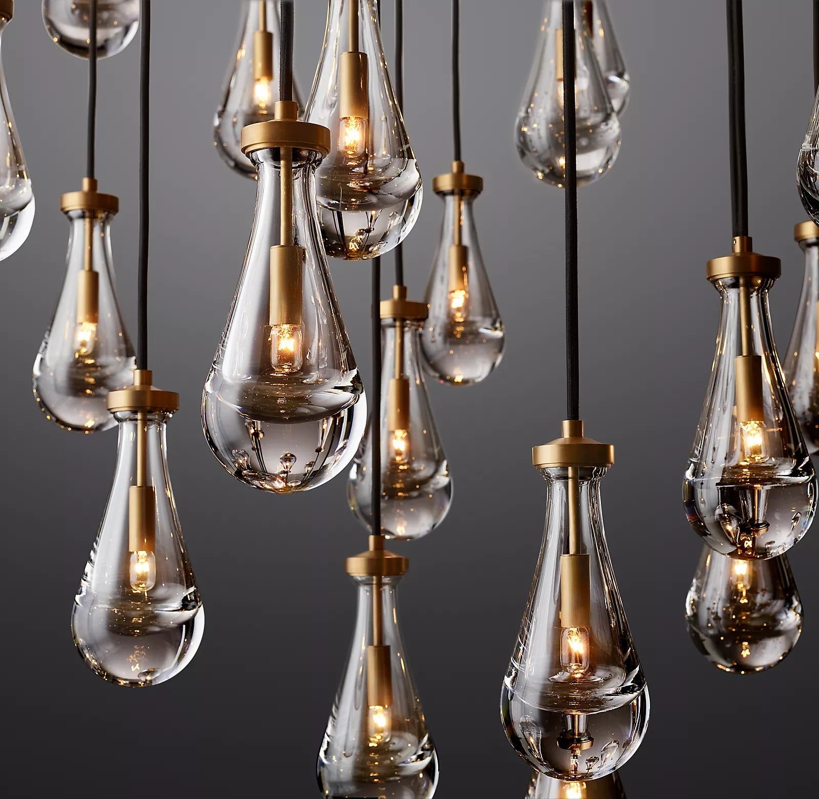 The Goccia Round Chandelier 60" transforms the rhythm of falling rain into a luminous sculptural centerpiece. Organic teardrop pendants in hand-blown glass cluster around the light source, creating a layered glow that feels fluid, atmospheric, and quietly dramatic. Suspended from slender black ropes and anchored by solid brass hardware, this round chandelier brings movement, texture, and soft reflected light to dining rooms, living spaces, bedrooms, and hospitality interiors.