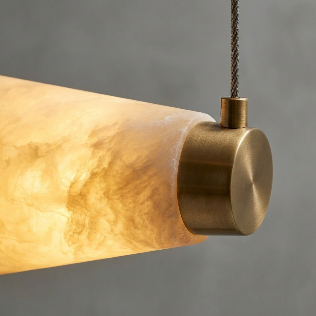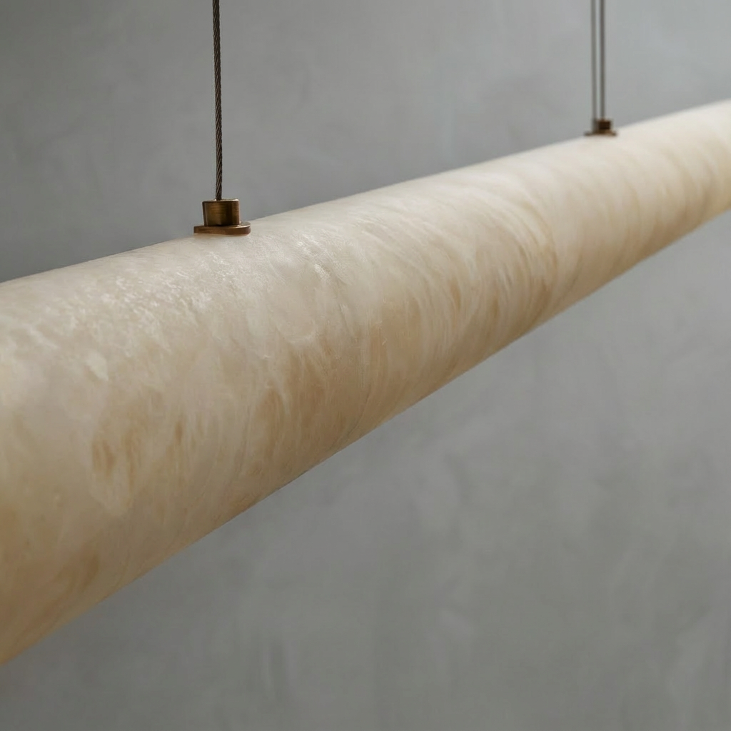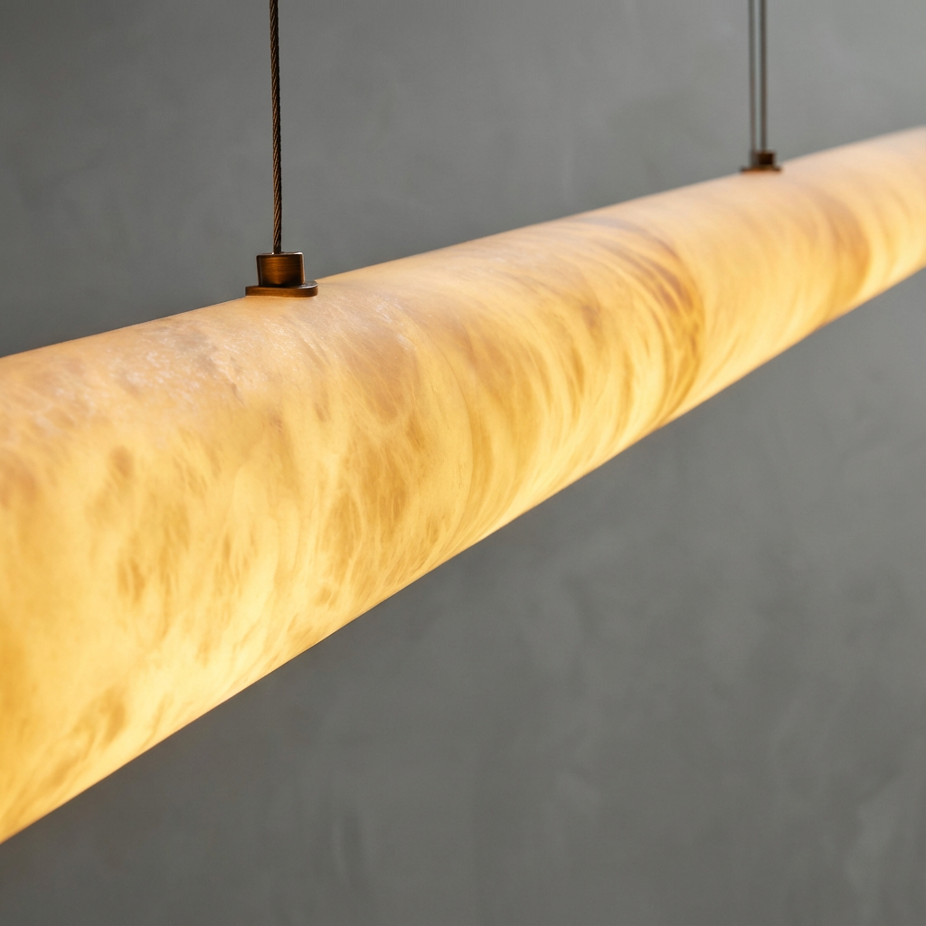 Introducing the Halima Linear Chandelier - a refined statement piece that stretches elegantly across the room, pairing elongated alabaster diffusers with a sleek architectural frame. The natural stone's soft gradients gently warm the space, making it ideal for long dining tables, kitchen islands, or minimalist interiors in need of elevated, natural illumination. This design celebrates material authenticity and the quiet luxury of natural stone lighting. Its alabaster (or calcite) surfaces enhance biophilic interiors and pair beautifully with wood, brass, bronze, concrete, and soft textiles. Handcrafted diffusers keep the stone's veining visible from multiple angles, ensuring every installation feels unique, tactile, and deeply connected to nature. With its calm radiance and soft ambient glow, the Halima Linear Chandelier brings refined architectural balance to modern organic spaces, Scandinavian-inspired rooms, luxury hospitality settings, and transitional homes. Whether illuminating dining areas, open living rooms, curated hallways, staircases, or boutique commercial interiors, it delivers sculptural presence with subtle emotional warmth.
