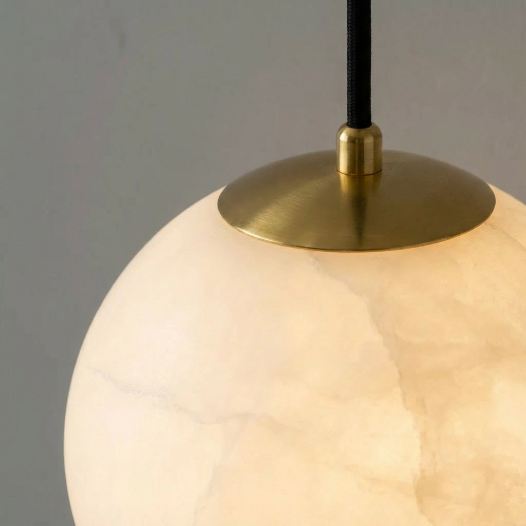 Crafted from alabaster (or calcite), this pendant celebrates material authenticity and the beauty of natural stone lighting. Its surfaces enhance biophilic interiors and pair effortlessly with wood, brass, bronze, concrete, and soft textiles. The handcrafted diffuser allows the stone's veining to remain visible from multiple angles, ensuring every installation feels unique, tactile, and connected to nature. Equally at home in modern organic settings, Scandinavian-inspired environments, luxury hospitality spaces, and transitional homes, the Halo Alabaster Pendant offers sculptural presence with subtle emotional warmth. With its soft ambient spread and refined architectural balance, it elevates dining areas, open living rooms, curated hallways, staircases, and boutique commercial interiors with ease.