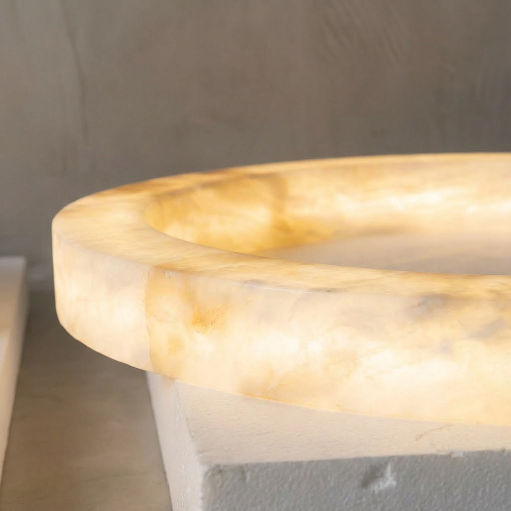 Introducing the Halo 600 LED Ring Suspended Lamp from our Alabaster Natural Stone series - a modern, sculptural ring suspended in space and crafted from natural alabaster. The continuous illuminated ring offers a soft, diffused glow around its entire circumference, while the stone itself brightens into gentle tonal shifts, bringing a calm, ambient presence to any setting. Celebrating material authenticity and the quiet luxury of natural stone lighting, this design highlights the organic veining and subtle translucency of alabaster (or calcite). Its handcrafted diffuser ensures the stone's unique patterns remain visible from multiple angles, so every installation feels one-of-a-kind, tactile, and closely connected to nature. The Halo 600 is ideal for quiet lounges, meeting spaces, and entryways seeking a clean, sculptural statement. Its warm, biophilic character pairs beautifully with wood, brass, bronze, concrete, and soft textiles, making it a natural fit for modern organic interiors, Scandinavian-inspired environments, luxury hospitality projects, and transitional homes. With its calm radiance and soft ambient spread, it gracefully elevates dining areas, open living rooms, curated hallways, staircases, and boutique commercial interiors with a sense of refined architectural balance.