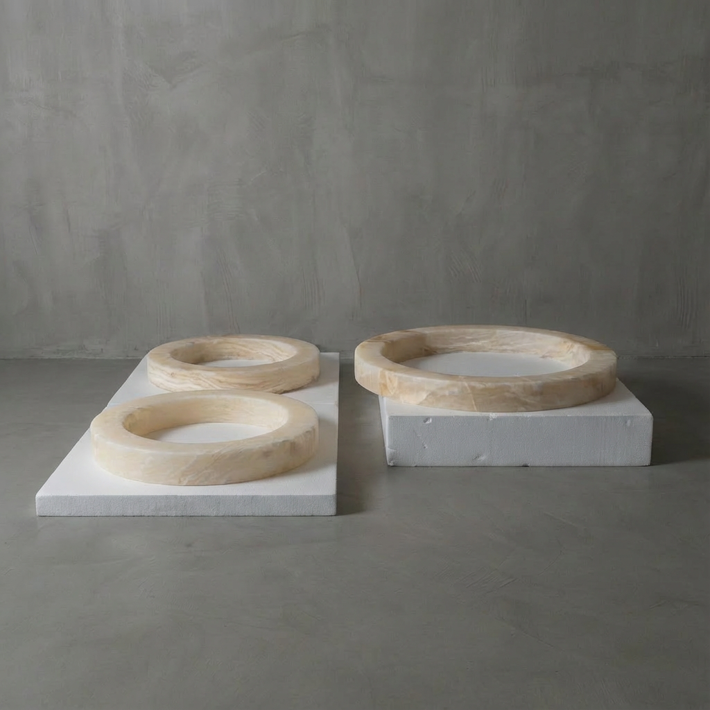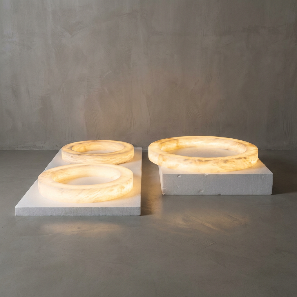 Introducing the Halo 600 LED Ring Suspended Lamp from our Alabaster Natural Stone series - a modern, sculptural ring suspended in space and crafted from natural alabaster. The continuous illuminated ring offers a soft, diffused glow around its entire circumference, while the stone itself brightens into gentle tonal shifts, bringing a calm, ambient presence to any setting. Celebrating material authenticity and the quiet luxury of natural stone lighting, this design highlights the organic veining and subtle translucency of alabaster (or calcite). Its handcrafted diffuser ensures the stone's unique patterns remain visible from multiple angles, so every installation feels one-of-a-kind, tactile, and closely connected to nature. The Halo 600 is ideal for quiet lounges, meeting spaces, and entryways seeking a clean, sculptural statement. Its warm, biophilic character pairs beautifully with wood, brass, bronze, concrete, and soft textiles, making it a natural fit for modern organic interiors, Scandinavian-inspired environments, luxury hospitality projects, and transitional homes. With its calm radiance and soft ambient spread, it gracefully elevates dining areas, open living rooms, curated hallways, staircases, and boutique commercial interiors with a sense of refined architectural balance.