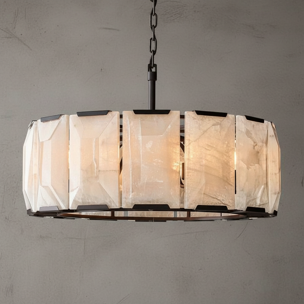Introducing the Harlow De Calcite Round Chandelier 24 - a sculptural round chandelier carved from natural calcite, offering a crystalline glow that balances clarity and warmth. Its luminous disc becomes an elegant focal point in dining rooms or contemporary living spaces, setting a calm, atmospheric tone. The design emphasizes material authenticity and the quiet luxury of natural stone lighting. Its alabaster (or calcite) surfaces enhance biophilic interiors and pair beautifully with wood, brass, bronze, concrete, and soft textiles. The handcrafted diffuser allows the stone's veining to remain visible from multiple angles, so every installation feels unique, tactile, and closely connected to nature. With its soft, ambient spread and serene radiance, this chandelier elevates modern organic spaces, Scandinavian-inspired rooms, luxury hospitality interiors, and transitional homes seeking sculptural lighting with subtle emotional warmth. It brings a sense of refined architectural balance to dining areas, open-plan living rooms, curated hallways, staircases, or boutique commercial settings.