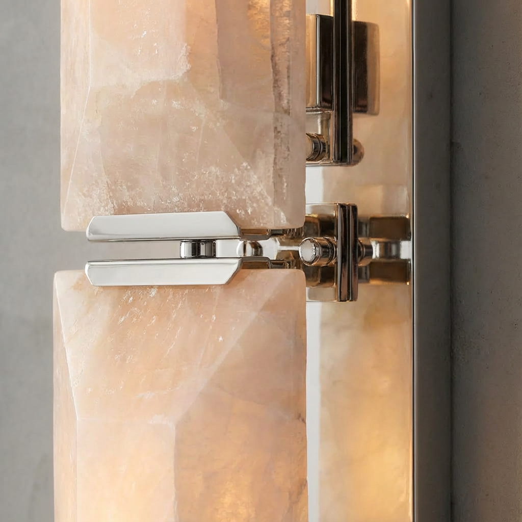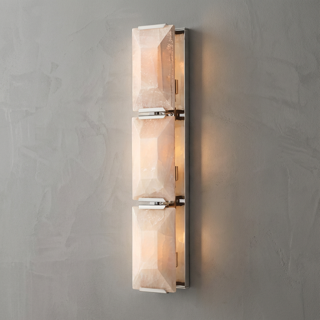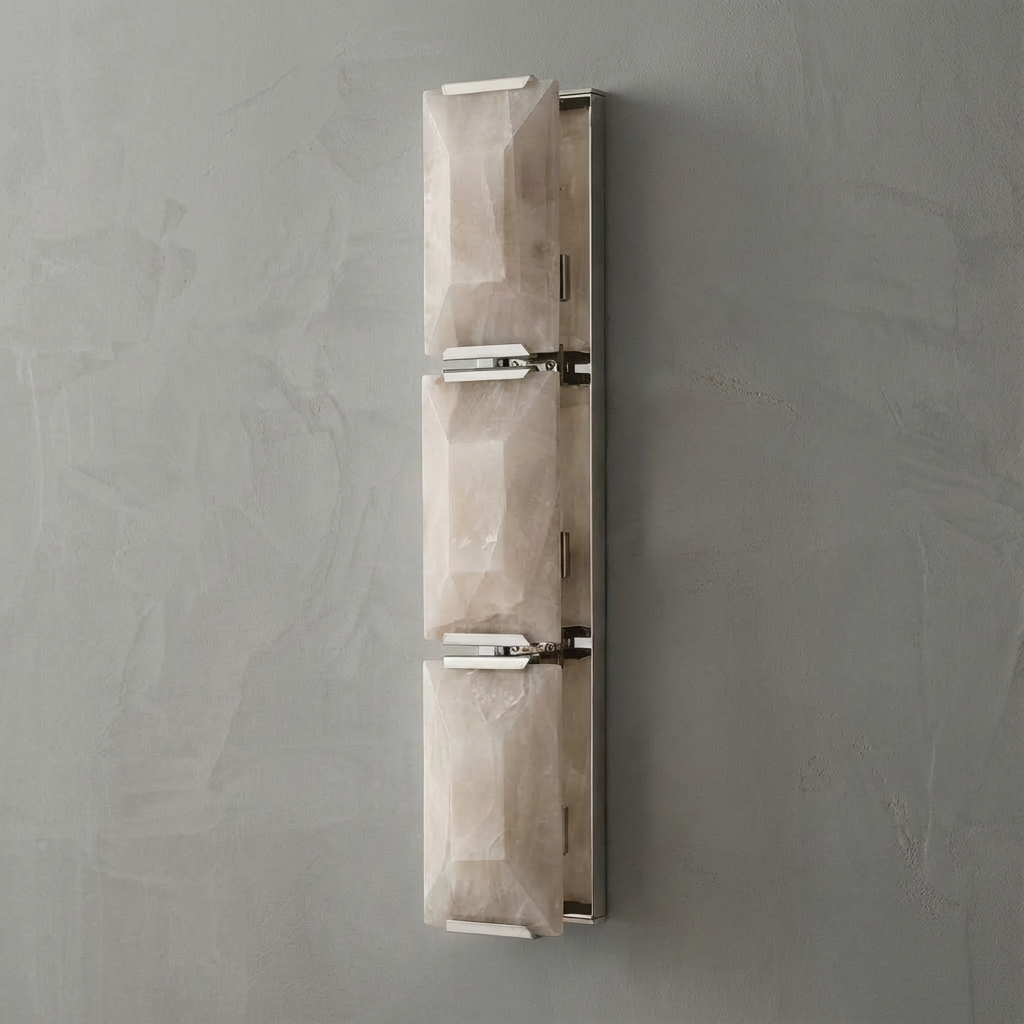 Introducing the Hewson Calcite Triple Sconce 1 - a sculptural triple-sconce composition carved from calcite, designed to deliver layered, atmospheric illumination. Its balanced, linear structure makes it an elegant choice for long corridors or for flanking architectural features, adding both function and refined visual rhythm to the space. This design emphasizes material authenticity and the quiet luxury of natural stone lighting. The alabaster (or calcite) surfaces amplify biophilic interiors, pairing beautifully with wood, brass, bronze, concrete, and soft textiles. Handcrafted diffusers allow the stone's natural veining to remain visible from multiple angles, so every installation feels unique, tactile, and deeply connected to nature. With its calm radiance and soft ambient spread, the Hewson Calcite Triple Sconce 1 works gracefully in modern organic settings, Scandinavian-inspired environments, luxury hospitality projects, and transitional homes seeking sculptural lighting with subtle emotional warmth. It elevates dining areas, open living rooms, curated hallways, staircases, and boutique commercial interiors with a sense of refined architectural balance.