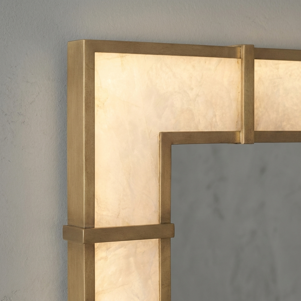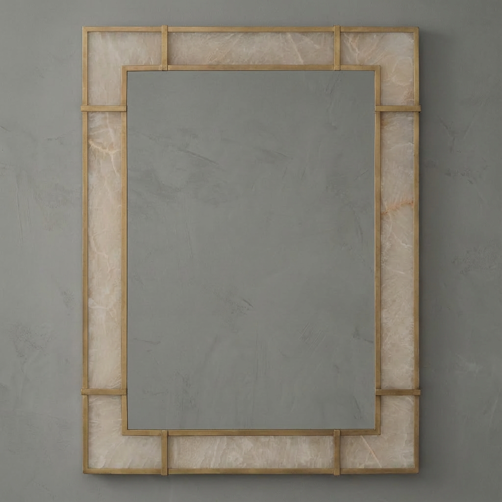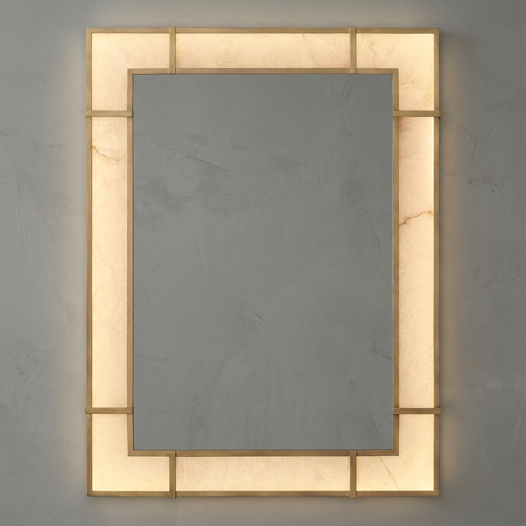 Soft illumination moves through the alabaster as if stirred from within, revealing feathered veining that shifts between pale ivory and warm cream. Paired with the warmth of antiqued brass, the mirror exudes a quiet luxury, bringing a gentle radiance to the dresser or vanity. The form features a subtle, sculptural curvature that catches the light at different angles, giving the piece a sense of slow, graceful movement. In quiet transitional spaces, bedrooms, or as part of a paired installation, it creates a calming presence-an understated glow that enriches surrounding materials without ever demanding attention.