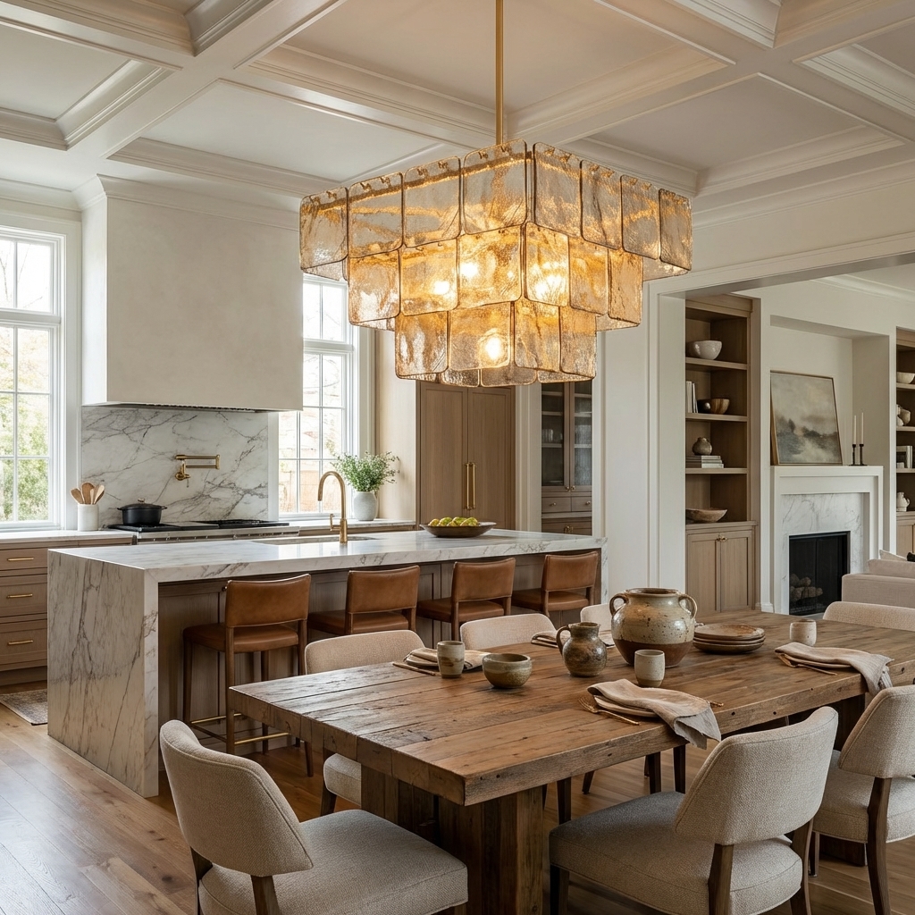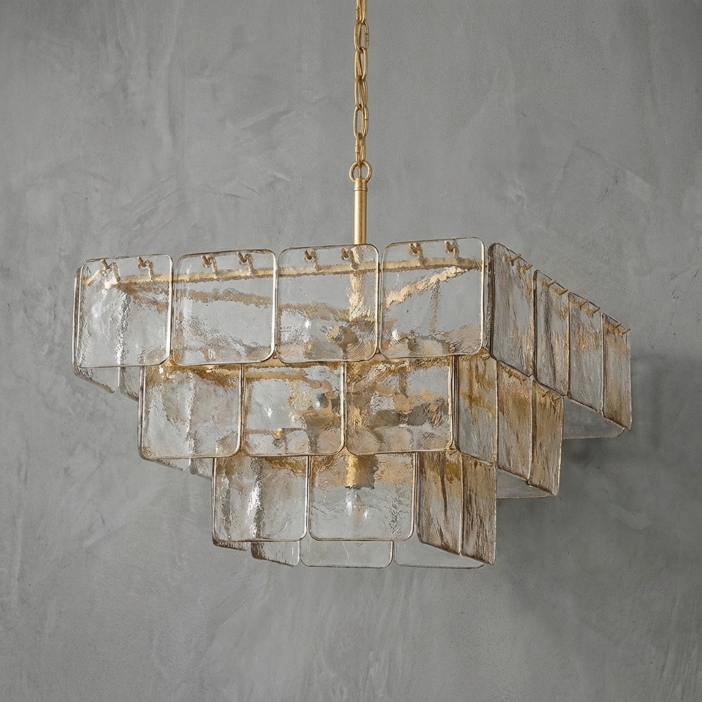 - Three-tier chandelier with irregular rough-cut glass slab tiles