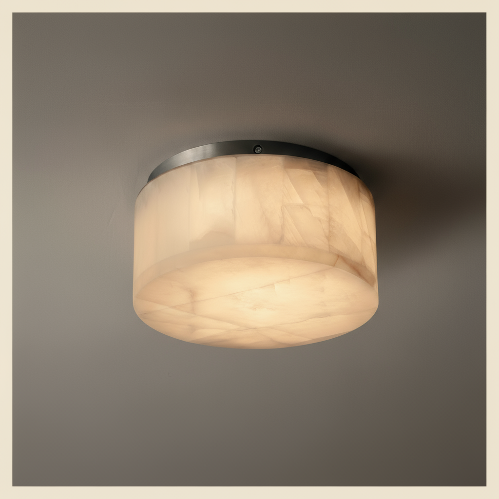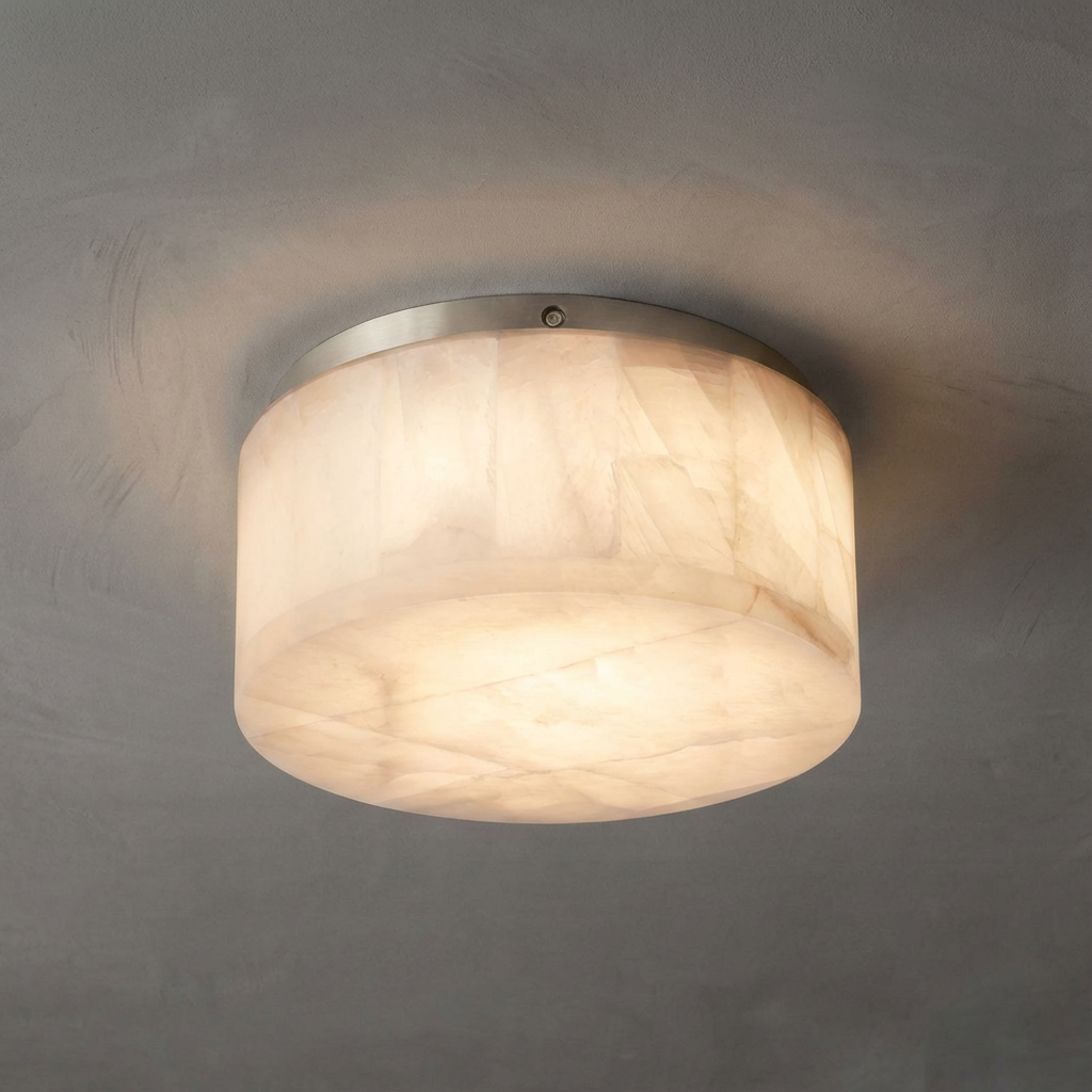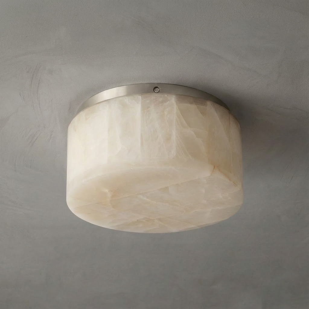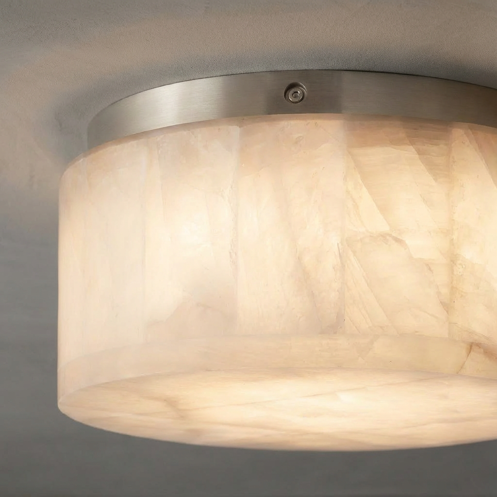 Introducing the Luna Alabaster Round Flush Mount 10 - a study in quiet luxury and natural beauty. Handcrafted alabaster takes center stage, coming alive with a slow, radiating warmth that deepens as light transitions through the stone. Each alabaster piece reveals its own mineral signature-soft marbling, gentle striations, and translucent patches-creating a glow that feels personal and distinctly organic. The effect is both sculptural and soothing, bringing emotional softness to any space. With its understated round profile and flush-mount design, this fixture remains elegantly minimal, making it a versatile addition to interiors that celebrate natural materials, refined textures, and modern, atmospheric lighting.