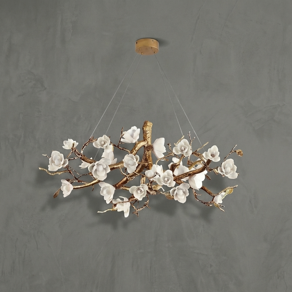 The Magnolia Branch Brass Chandelier brings a sculptural, nature-inspired presence to interiors with its organic cluster of metal petals and ceramic accents. Designed in the Magnolia series, this chandelier evokes the soft bloom of magnolia flowers while delivering a refined brass finish suited to both classic and contemporary spaces.