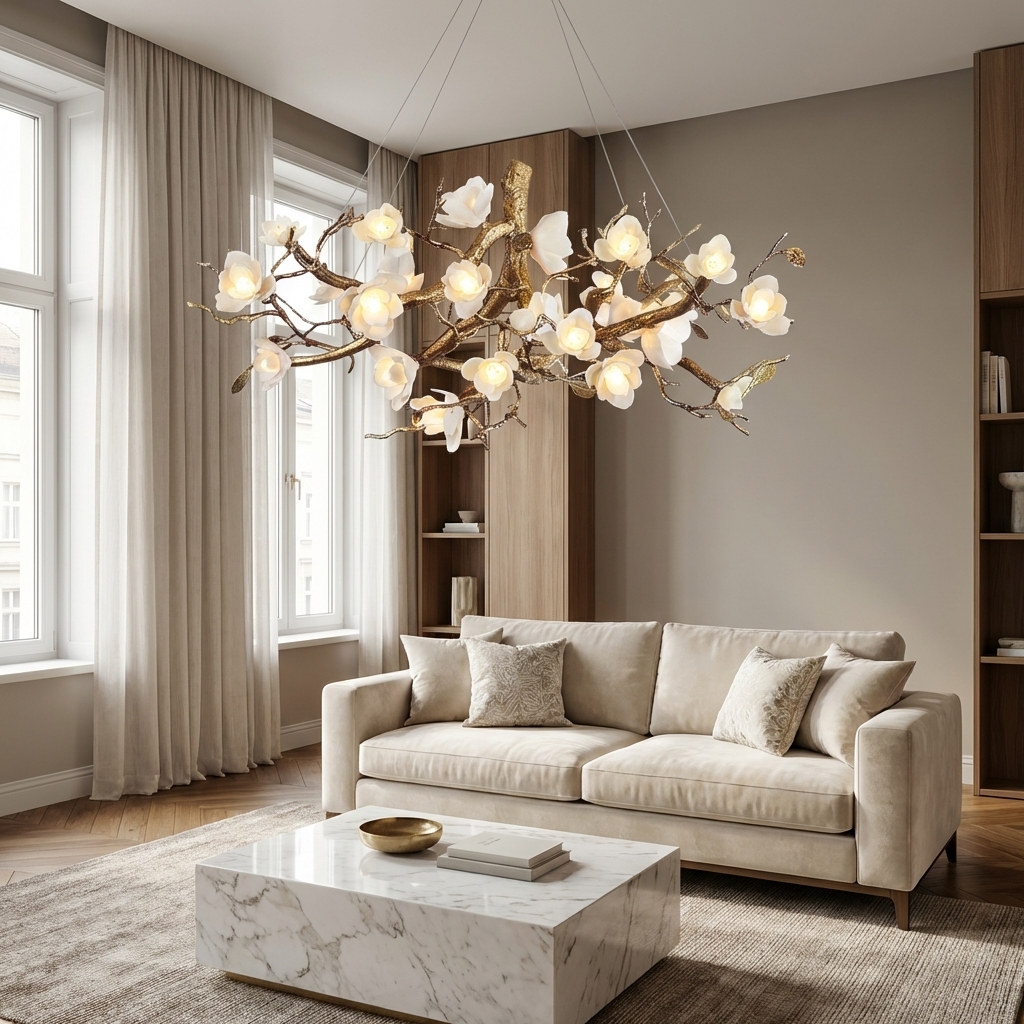 - Style: Sculptural organic chandelier inspired by magnolia blooms