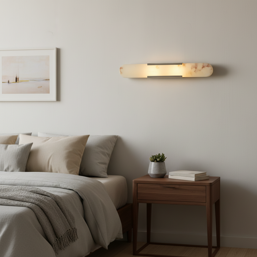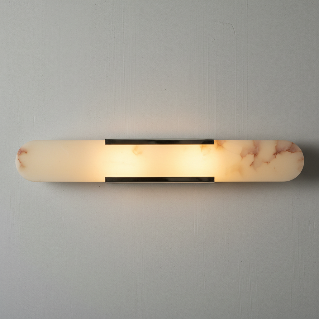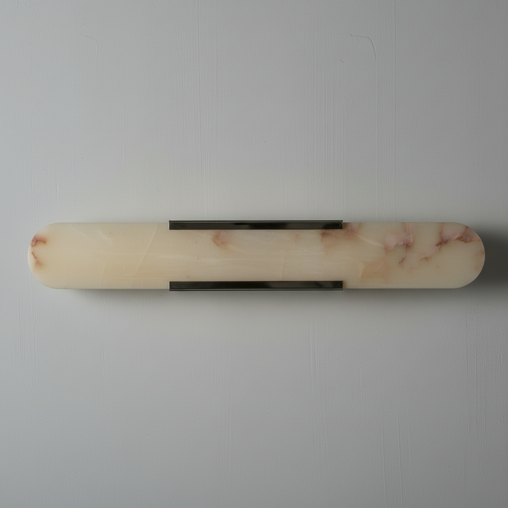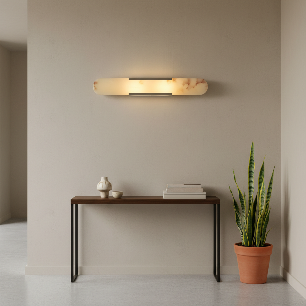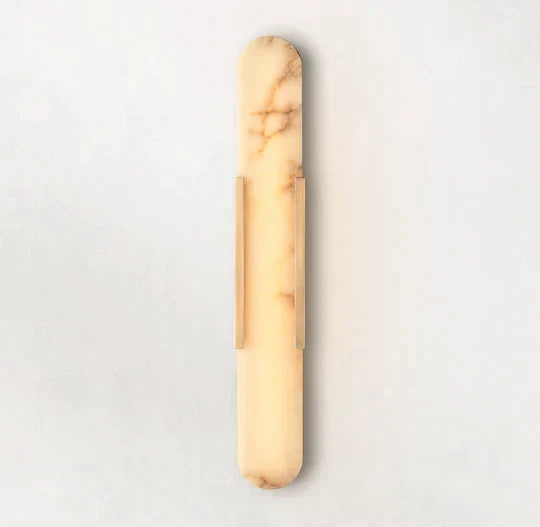 Introducing the Dl Koltin Melange Elongated Alabaster Wall Sconce - a modern indoor decor wall lamp that brings subtle, atmospheric illumination to refined interiors. The elongated alabaster stone glows with a gentle inward pulse, its surface coming alive in feathered tones of ivory and warm cream for a softly luminous effect. A mild asymmetry in the profile enhances its handcrafted feel, making each fixture appear artful and unique. This understated character allows the wall sconce to pair beautifully with natural materials such as wood, plaster, and brushed metals, seamlessly integrating into sophisticated, layered spaces. Designed for interiors that rely on atmosphere rather than intensity, this alabaster wall sconce is ideal for creating a warm, elegant ambiance in living rooms, bedrooms, hallways, or any setting that calls for modern, elevated lighting.