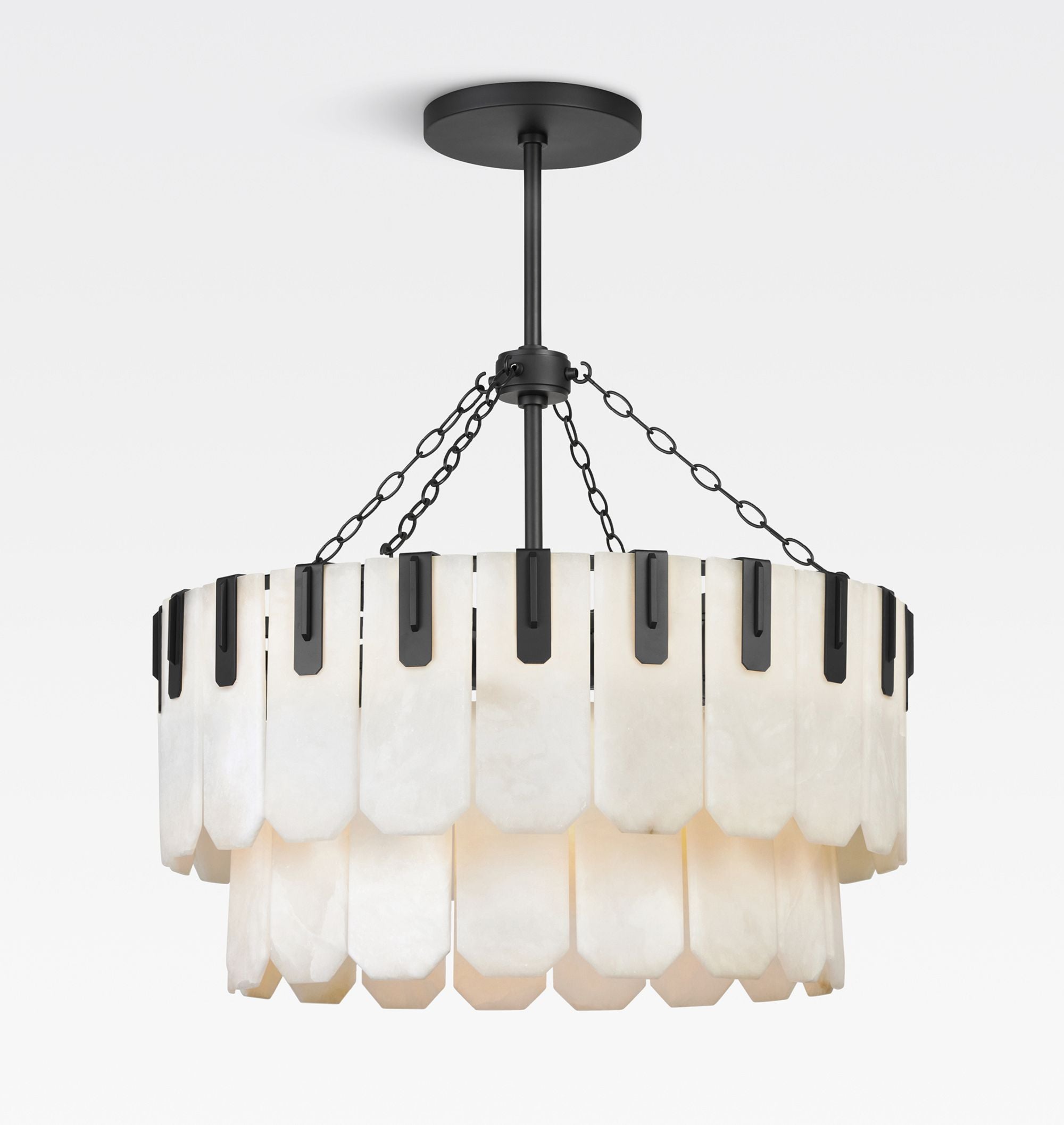 Introducing the Nadia Double Tier Alabaster Chandelier 30 41 Series - a refined study in form, light, and natural stone. This modern design treats alabaster as an architectural element, pairing its organic beauty with disciplined geometry for a quietly luxurious presence. The alabaster diffuser showcases measured layers of veining and tonal variation, offering a soft, even glow. Light is distributed with control and clarity, creating illumination that feels ordered and understated rather than dramatic. With its clean, double-tier silhouette and high-end finishes, this chandelier integrates seamlessly into formal dining rooms, streamlined corridors, and professional interiors. It's an ideal choice wherever structure, balance, and an elevated material palette define the space.