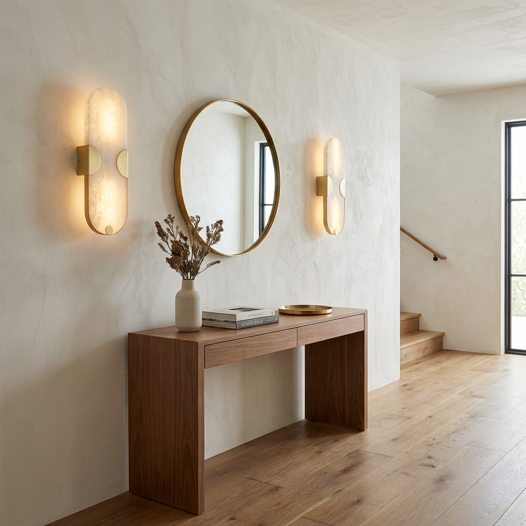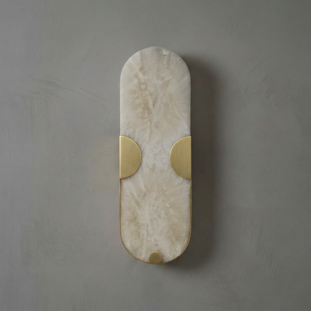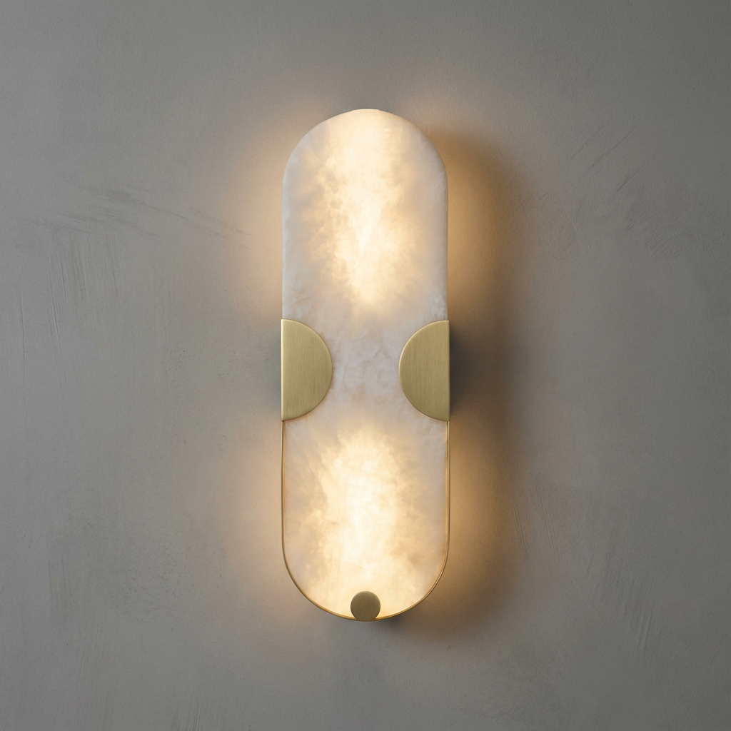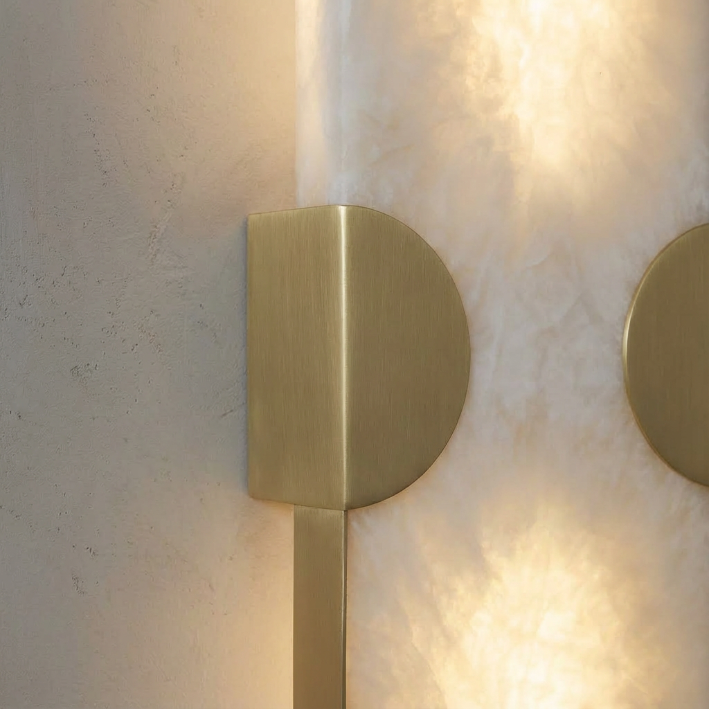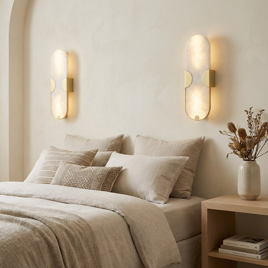 Introducing our Pair Of Alabaster Sconces - a study in quiet elegance and sculptural light. A gentle radiance flows through the alabaster, awakening subtle mineral formations that appear to drift just beneath the surface, giving each piece a naturally unique character. The refined, sculptural form feels as if it has been carved from stone, softly diffusing light into warm, atmospheric layers. These alabaster sconces bring a serene presence to bedrooms, meditative passages, or living spaces shaped by organic textures and understated luxury. Use them as a harmonious pair to frame an entryway, highlight architectural details, or create a calm, luminous backdrop wherever you seek a sense of tranquil sophistication.