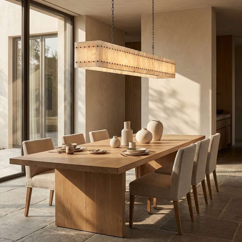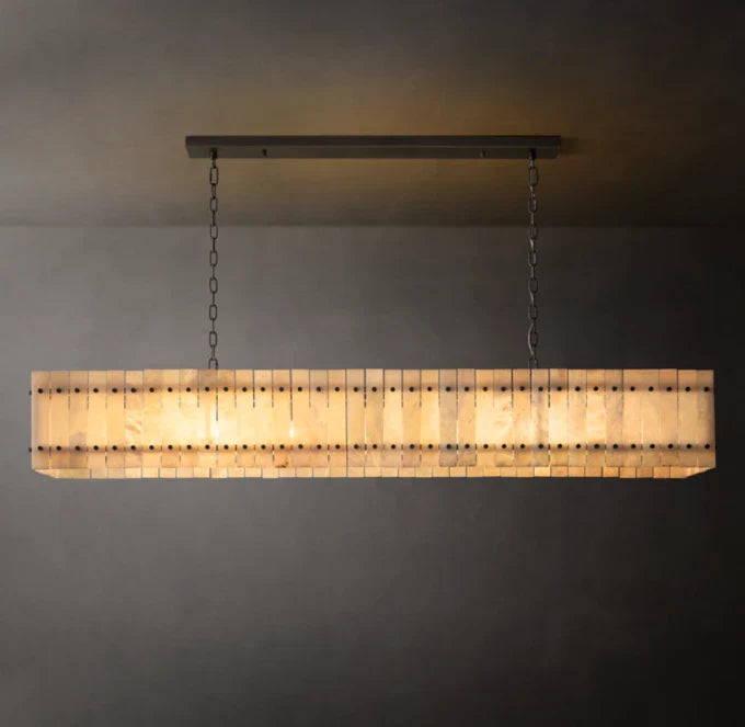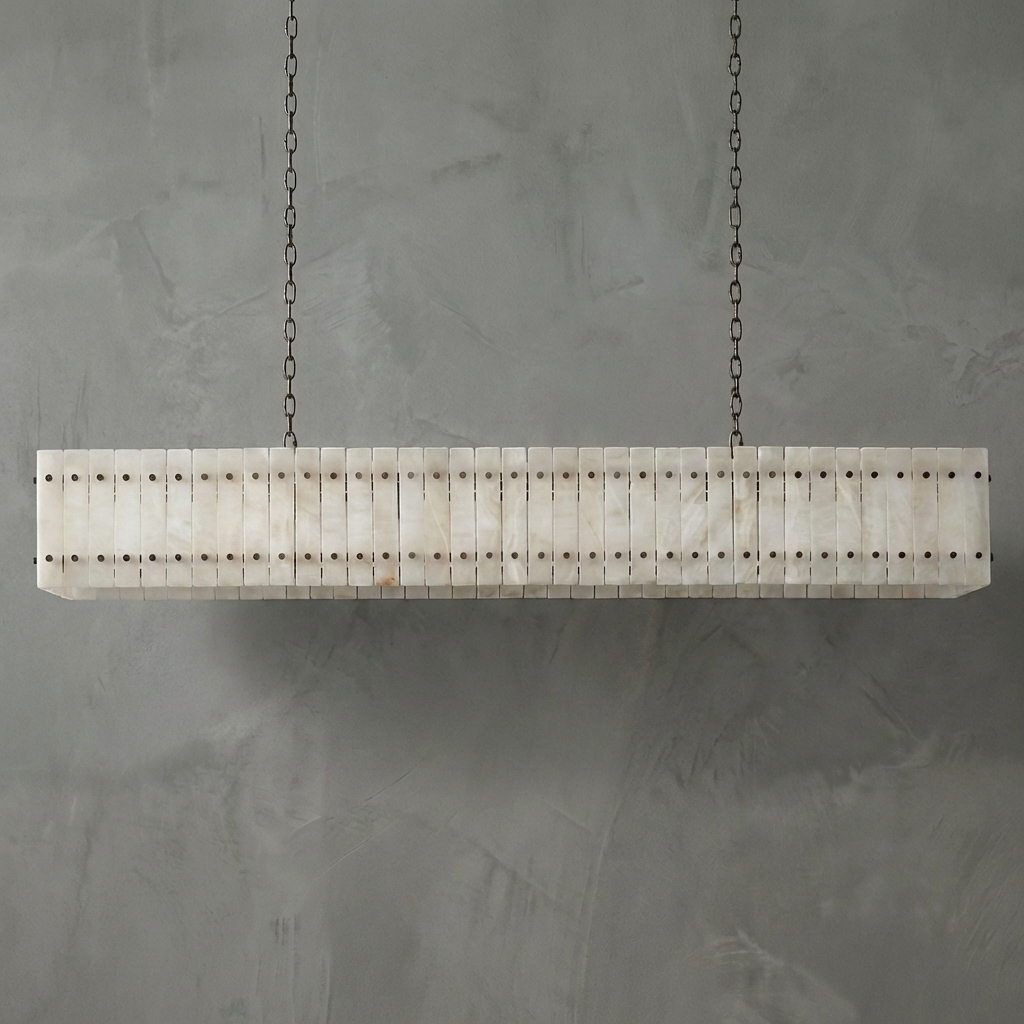 The Pietra Viva Linear Chandelier 72" Backup pairs sculptural form with a soft, ambient glow. Handmade alabaster panels showcase natural stone veining, diffusing light beautifully across a sleek steel frame for a refined statement over dining tables, kitchen islands, and long living spaces.