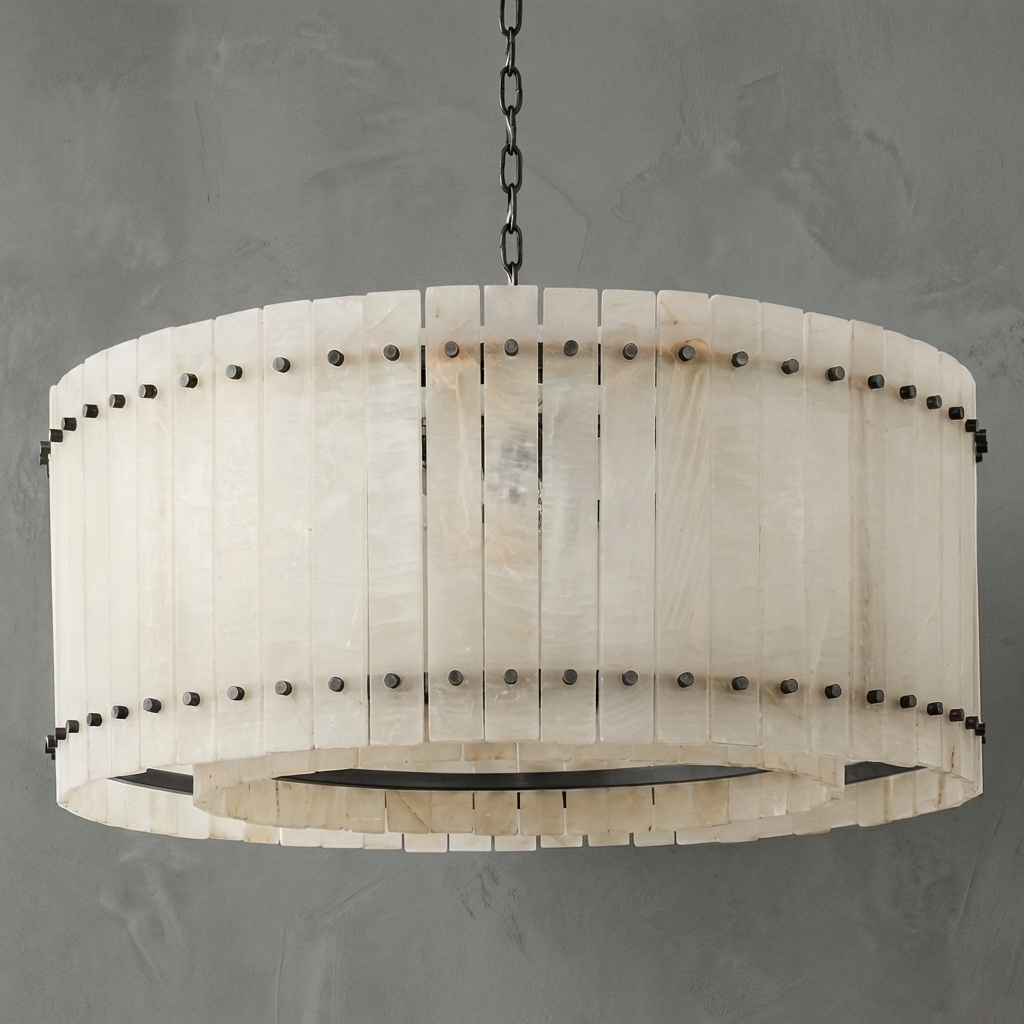 - Materials: Handmade alabaster panels, steel frame, metal chain and canopy