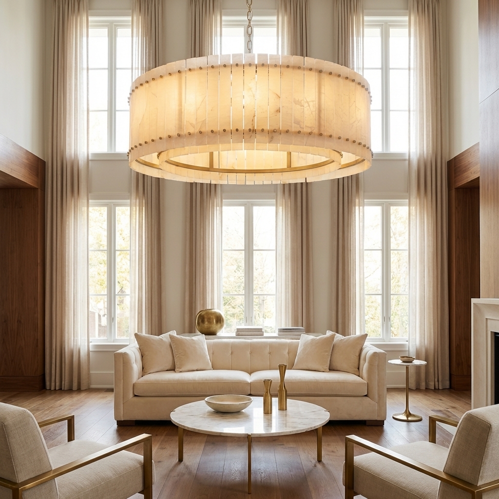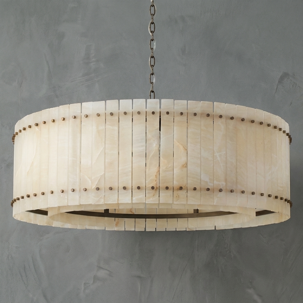 - Materials: Handmade alabaster panels, steel frame, metal chain, metal canopy