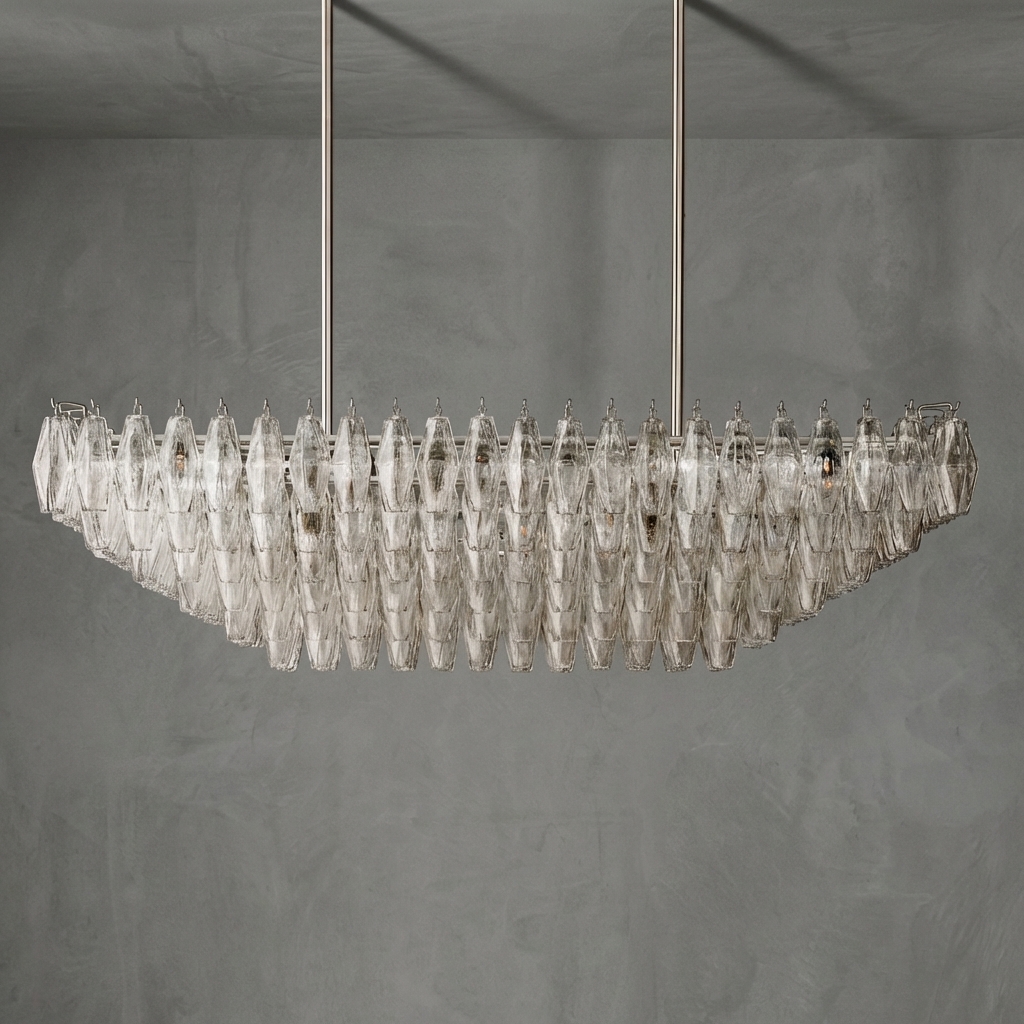 The Poliedra Clear Glass Tiered Rectangular Chandelier 54'' brings the glamour of 1950s Italian lighting into a refined, architectural form. Suspended from a tiered steel frame, it is dressed with dozens of hand-blown Murano-inspired poliedri glass elements, each individually hung to create a luminous, faceted mosaic. When illuminated, the clear polyhedral glass pieces reflect and refract light with dramatic brilliance, giving the chandelier its signature shimmering character.