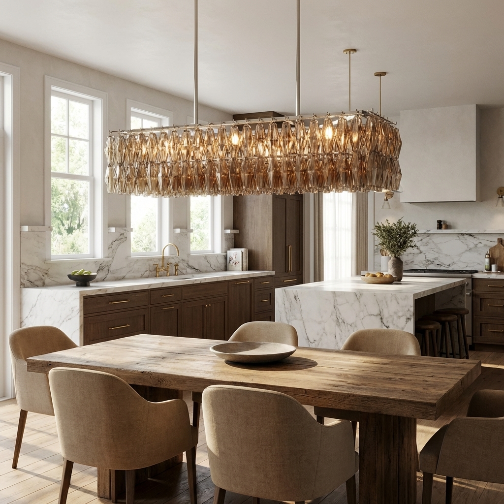 Designed for dramatic impact, the fixture features integrated suspension rods for adjustable installation height and a long rectangular canopy suited to larger tables and open-plan rooms. The warm 2700K glow enhances the depth and shimmer of each glass element, while 19 E12 candelabra sockets provide dimmable illumination. Inspired by 1950s Italian design, the Poliedra Glass Rectangular Chandelier 54" balances ornament and restraint for a timeless, architectural presence.