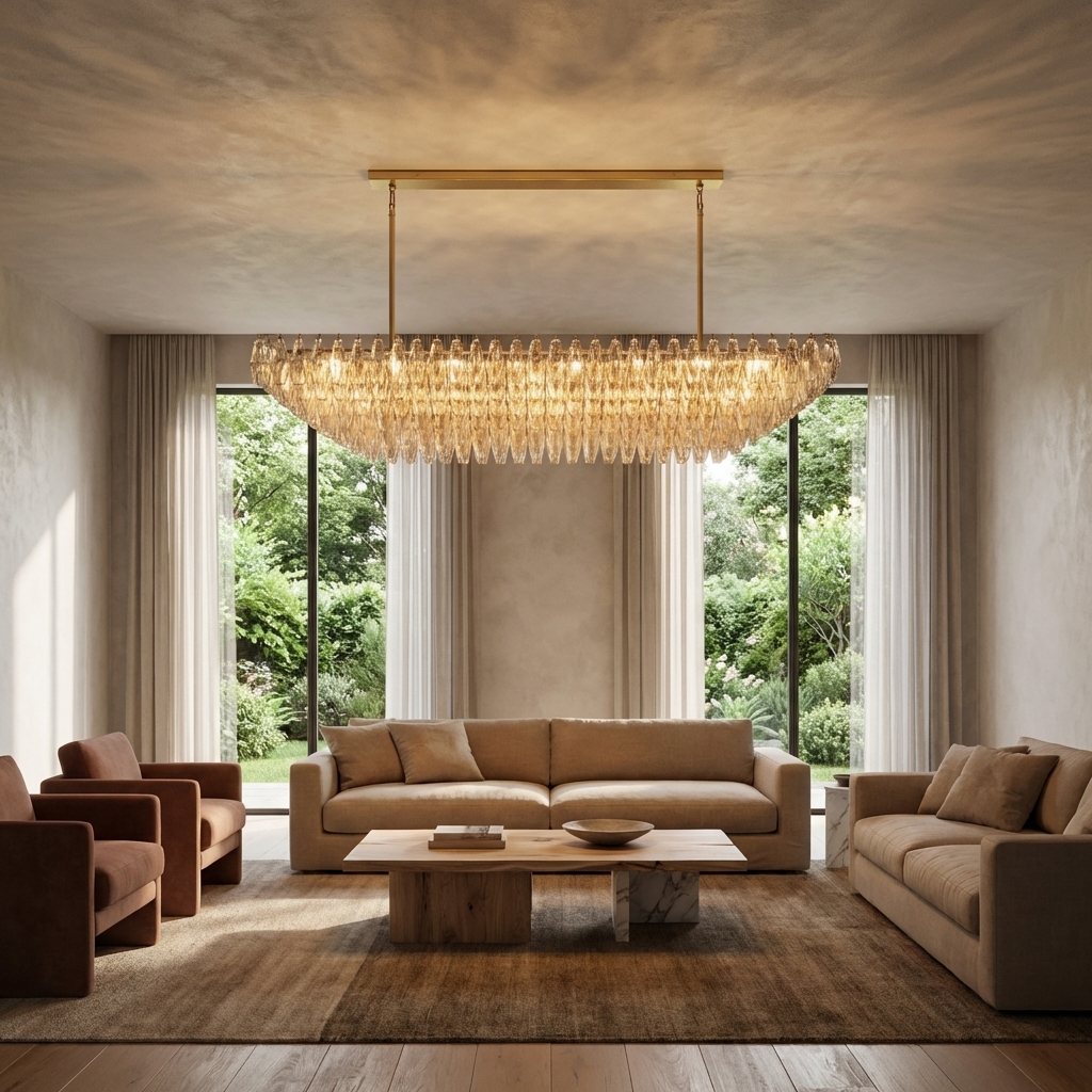 The Poliedra Glass Tiered Rectangular Chandelier 74" is a commanding centerpiece that balances vintage Italian inspiration with clean-lined modern luxury, delivering radiant texture and unmistakable presence in any grand interior.