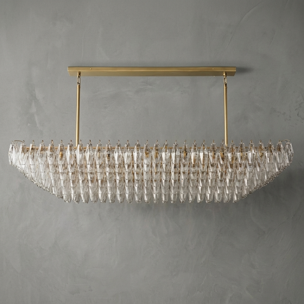 The Poliedra Glass Tiered Rectangular Chandelier 74" brings sculptural 1950s Italian lighting style into a bold rectangular form. Suspended from a tiered steel frame, this statement chandelier is dressed with dozens of hand-blown Murano-style poliedri glass pieces, each individually hung and shaped to catch, reflect, and refract light in a shimmering mosaic. The result is a dramatic glow that feels both minimalist and richly textured.