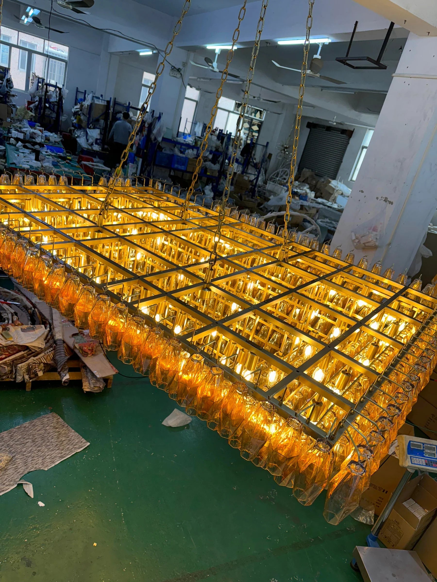 - Dozens of hand-blown glass polyhedra create a sparkling, layered light effect