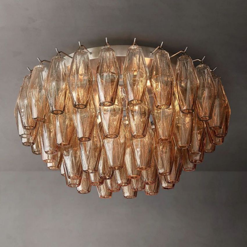 With its layered faceted glass and tailored metal frame, Poliedra Smoke Glass Flushmount 22" delivers both vintage glamour and minimalist clarity, offering a dramatic yet versatile ceiling light for interiors that favor texture, sparkle, and timeless form.