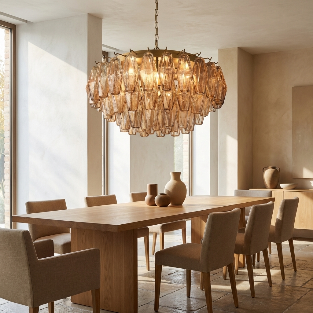 - Glass style: Hand-blown Murano-style poliedri / faceted polyhedral glass pieces