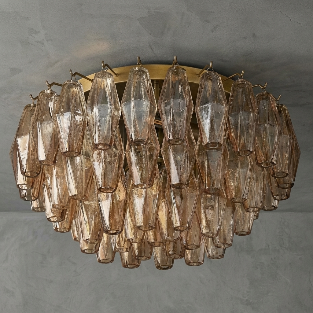 Poliedra Smoke Glass Flushmount 22" brings the spirit of 1950s Italian lighting into a refined flushmount silhouette. Inspired by classic Murano poliedri chandeliers, it features dozens of hand-blown smoke glass polyhedral pieces suspended from a tiered steel frame, where each faceted element catches, reflects, and refracts light to create a luminous mosaic overhead.