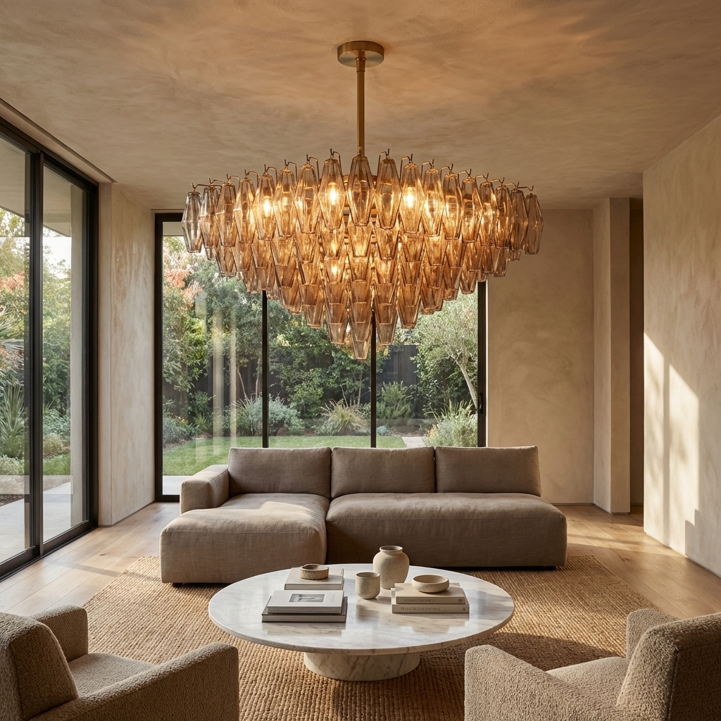 The hand-blown glass elements create rich tonal variation and sparkle, giving the chandelier a jewel-like effect whether illuminated or at rest. Its structured square form pairs beautifully with both classic and contemporary spaces, while the smoke glass finish introduces a moodier, more dramatic expression than clear versions.
