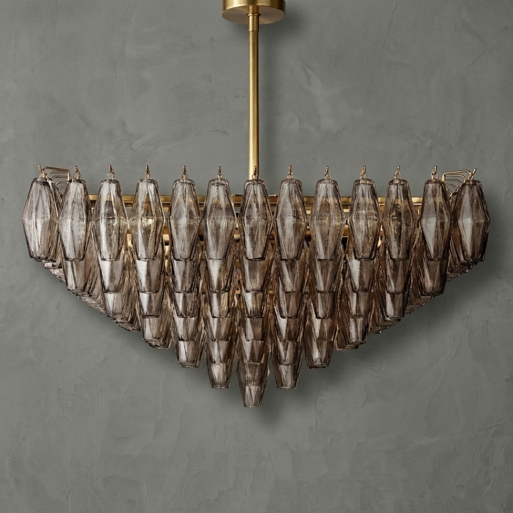 The Poliedra Smoke Glass Square Chandelier 32" brings a sculptural, shimmering presence to interiors with its signature Murano-inspired poliedri glass. Faceted hand-blown smoke glass pieces are arranged on a refined brass frame, creating a luminous mosaic effect as each element catches and reflects light differently. The square silhouette gives this chandelier a bold architectural balance, making it especially striking above dining tables, in living rooms, foyers, and hotel-style interiors.