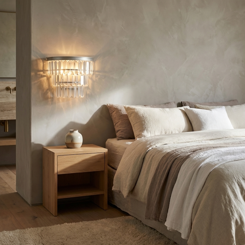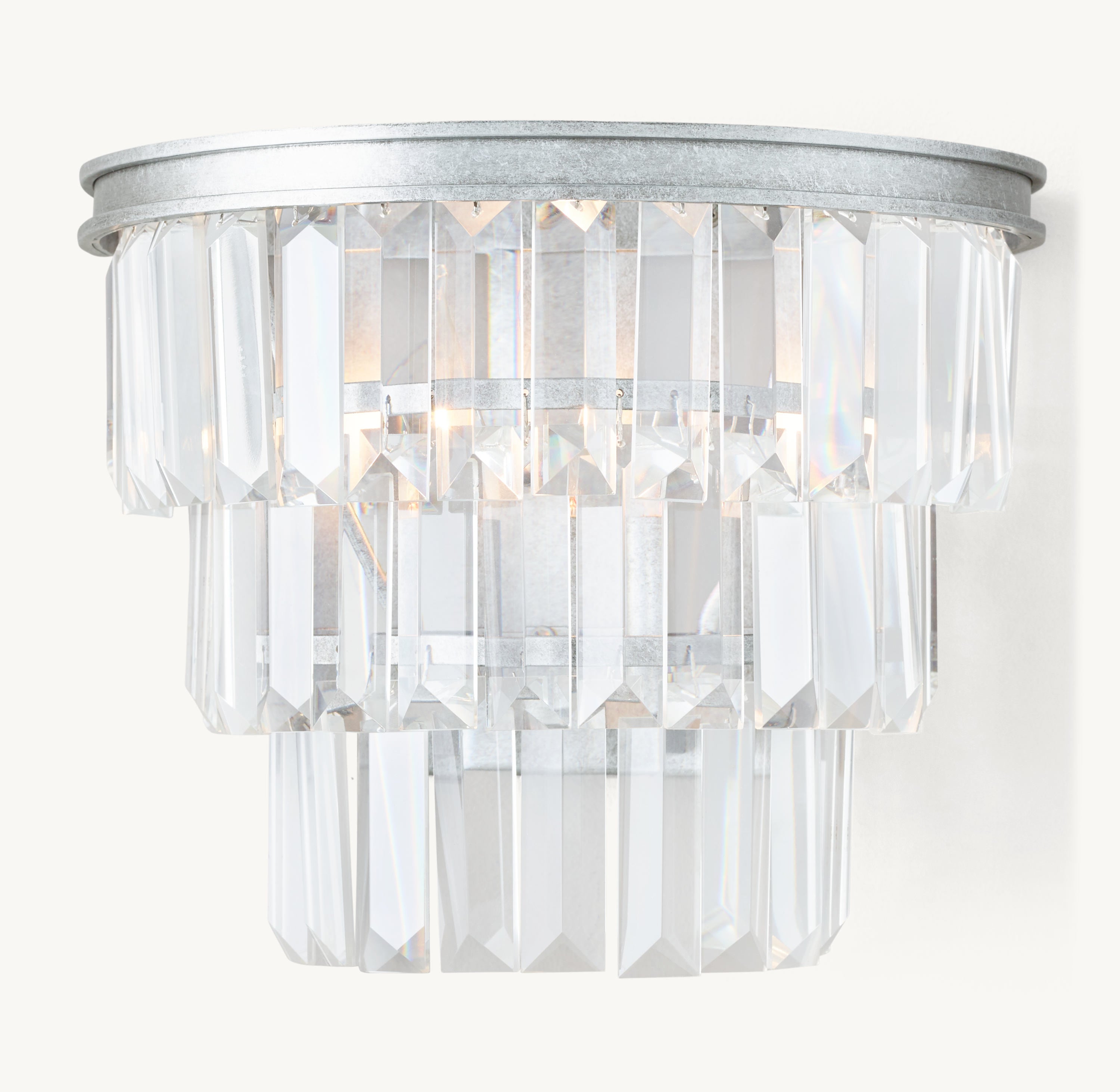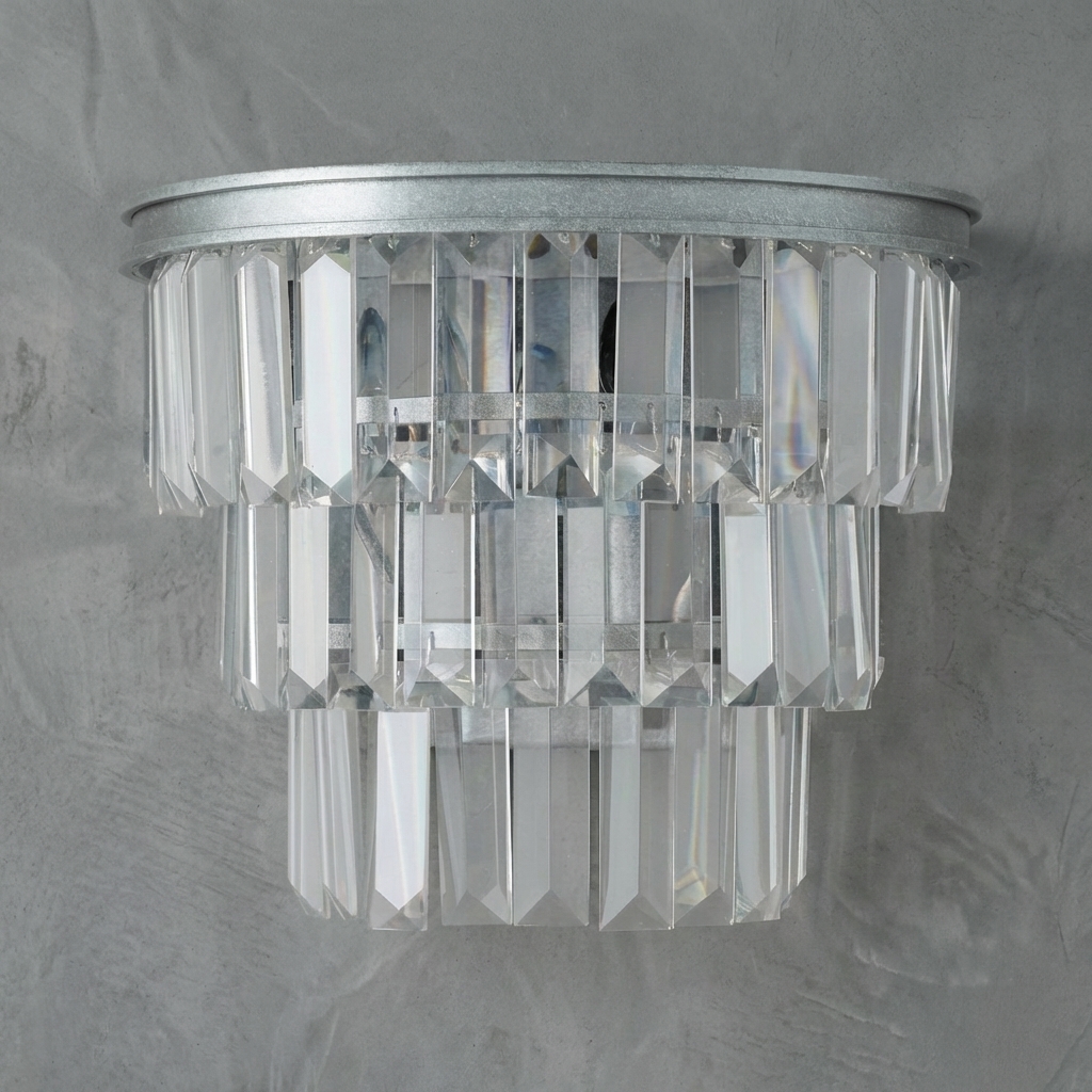 Bring sculptural sparkle to the wall with the Prismaire Sconce Silver 8''H. Inspired by Art Deco glamour, this tiered design features graduated rectangular cut crystal bars suspended within a diamond-like silhouette, where hand-applied aged silver-finished iron rings add refined vintage character. When illuminated, the faceted crystals refract light into subtle prismatic rainbows, creating an elegant ambient glow.