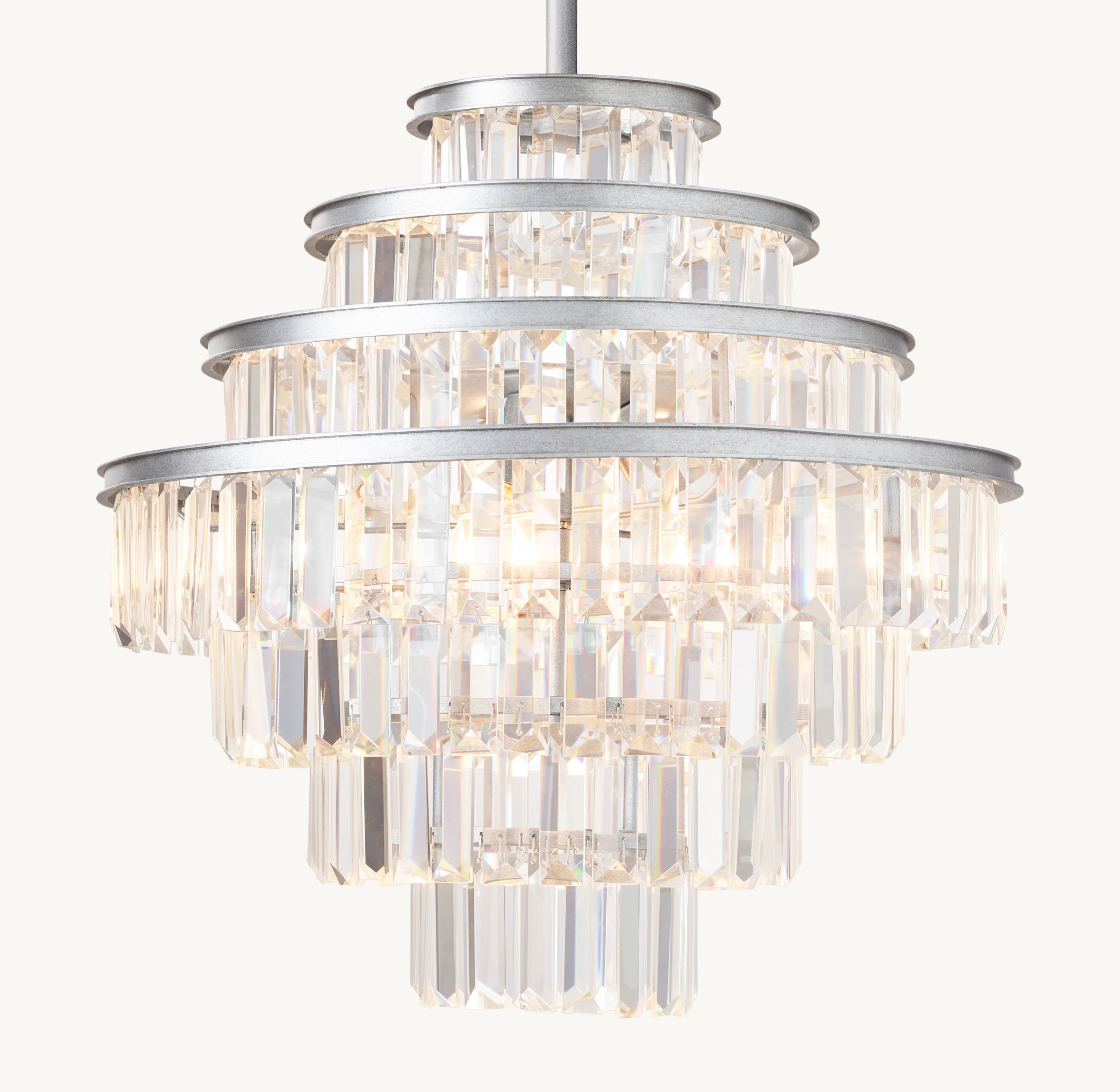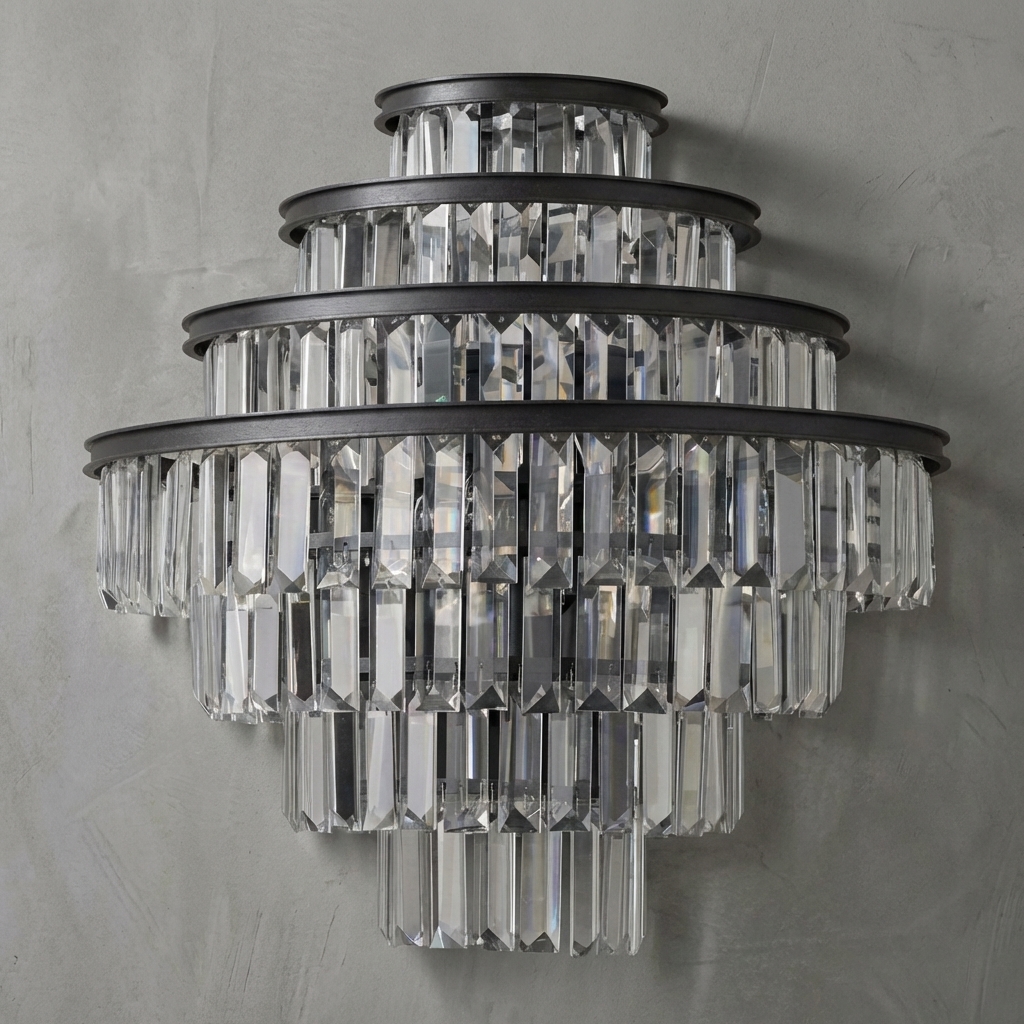 - Materials: iron frame with graduated tiers of rectangular cut crystals