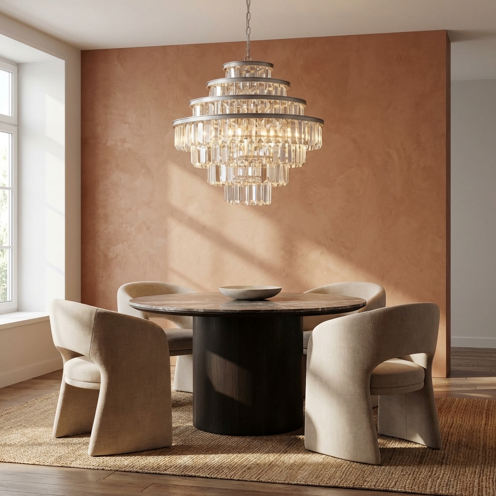 The Prismaire Small Pendant 18"D brings refined Art Deco glamour to the ceiling with a striking diamond silhouette formed by tiered crystal prism bars and hand-finished metal detailing. Graduated rectangular cut crystals refract light into prismatic rainbows, creating a brilliant focal point for dining rooms, bedrooms, entryways, and other dry indoor spaces.