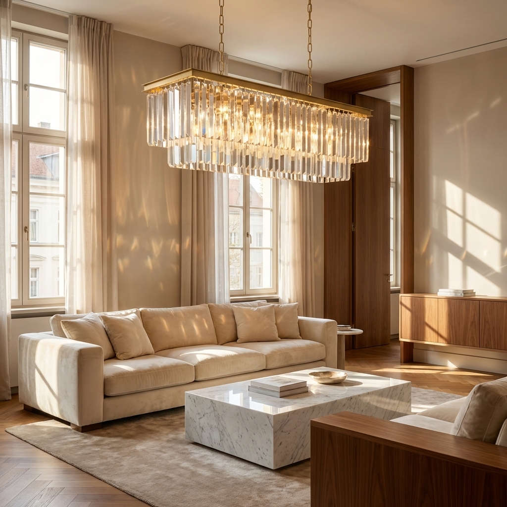 Designed to deliver both sparkle and structure, the Prismatique Classicm Rectangular Chandelier 49" is ideal for interiors that call for a refined geometric statement. Each faceted prism enhances the light output with dazzling clarity, while the elongated rectangular form suits dining tables, kitchen islands, and long entry spaces beautifully.