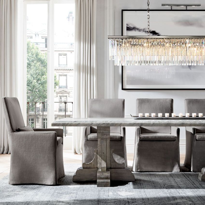 Prismatique Classicm Rectangular Chandelier 49" captures the glamour of 1920s Paris with a bold Art Deco silhouette. Tiered K9 crystal prisms hang like luminous fringe from a welded iron frame, creating brilliant refraction and a striking balance of elegance and industrial character. Strong geometric lines and a refined metallic finish make this rectangular chandelier a dramatic centerpiece for dining rooms, living rooms, foyers, and hotel-style interiors.
