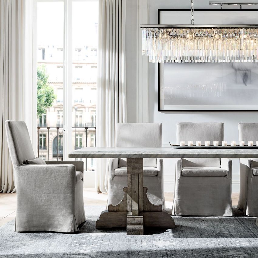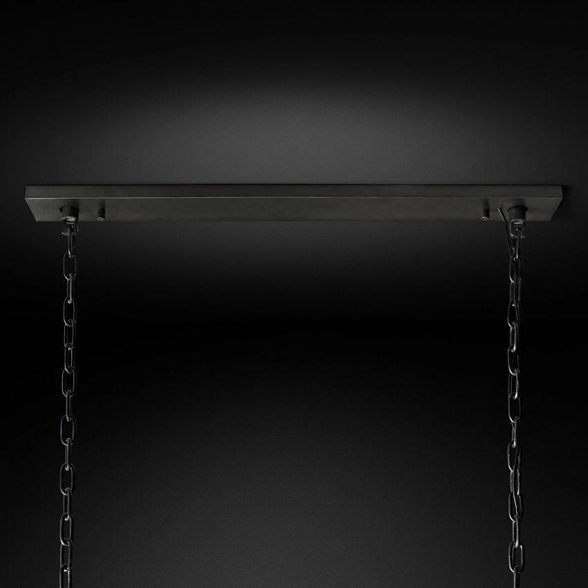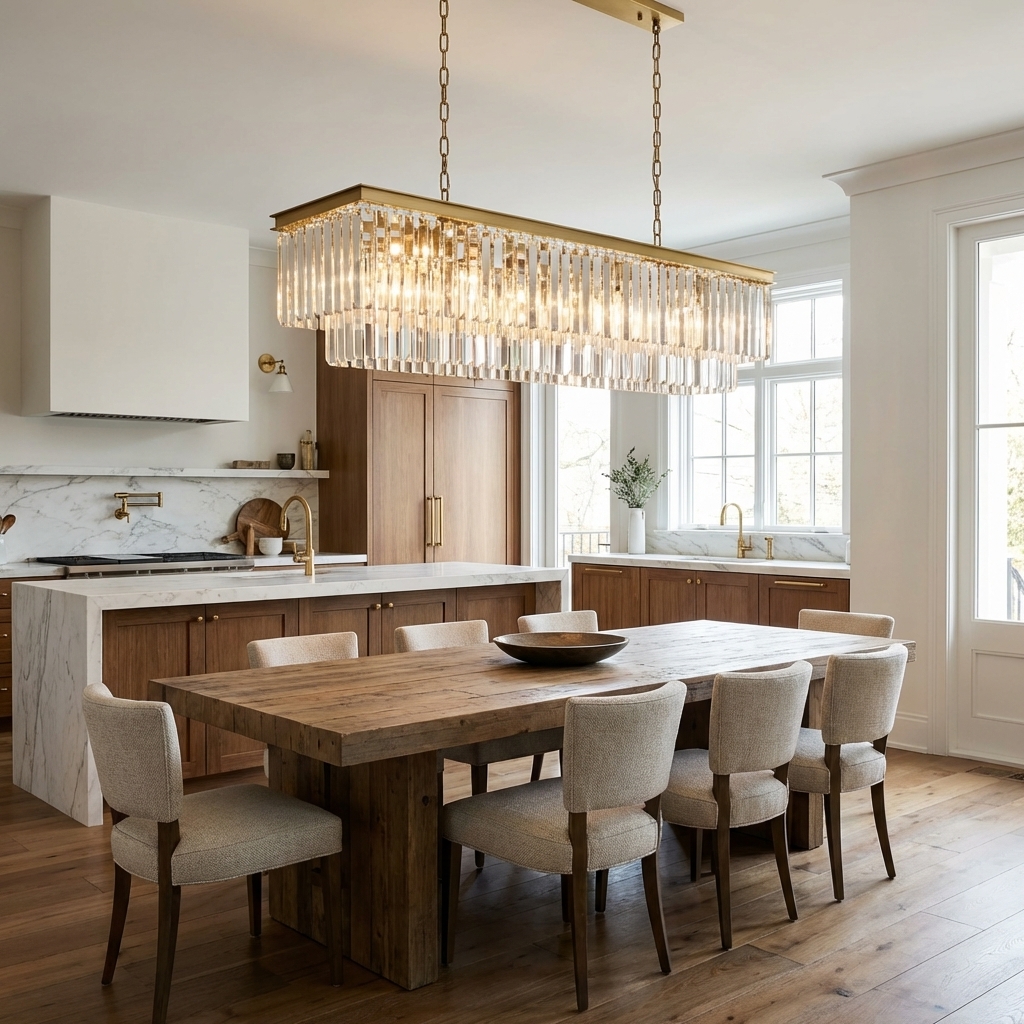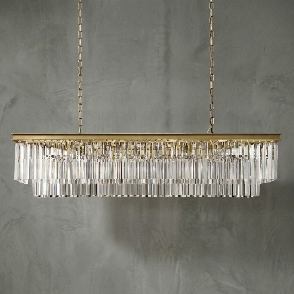 Its elongated form makes it especially suited for placement above rectangular tables and islands, while the faceted crystal prisms deliver brilliant refraction from every angle. The result is a chandelier that feels luxurious, structured, and visually light despite its substantial presence.