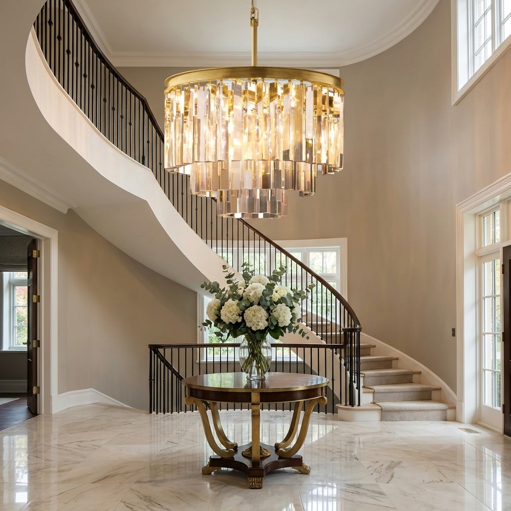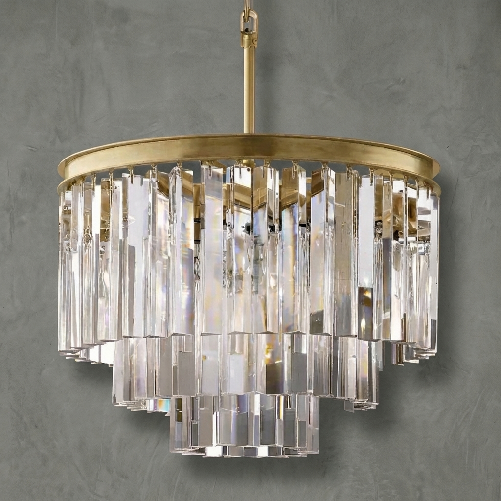 The Prismatique Classicm Round Chandelier 20" brings sculptural glamour to interiors with tiered K9 crystal prisms suspended within a bold geometric metal frame. Crisp lines, brilliant refraction, and a refined tiered silhouette make this chandelier a striking choice for dining rooms, living rooms, bedrooms, hotel hallways, and foyer entryways.