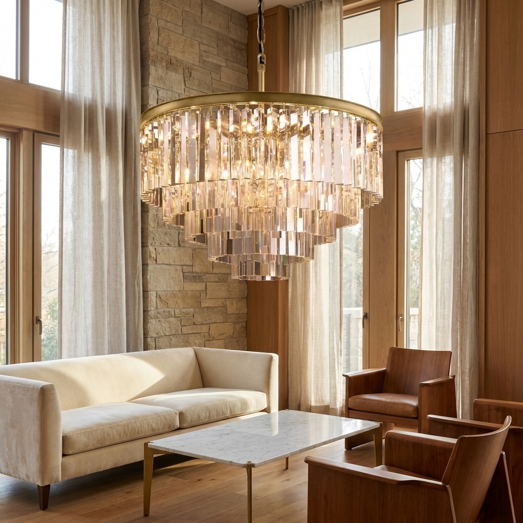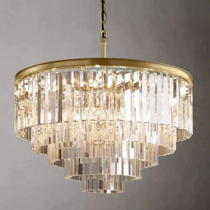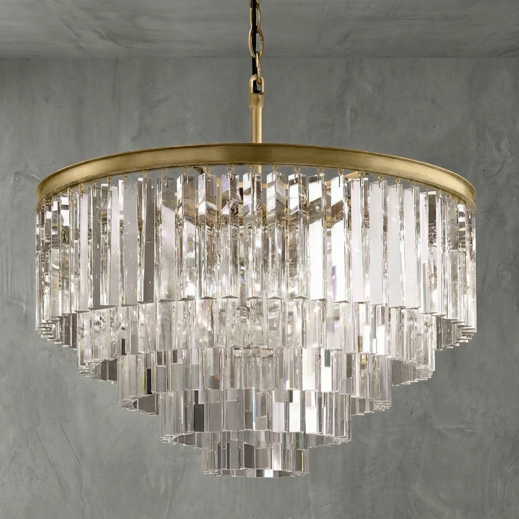 Prismatique Classicm Round Chandelier 32" brings Art Deco glamour into a bold geometric silhouette. Inspired by 1920s Paris, this tiered chandelier features hundreds of faceted K9 crystal prisms suspended from a welded iron frame, creating dazzling refraction and a refined contrast of elegance and industrial character.