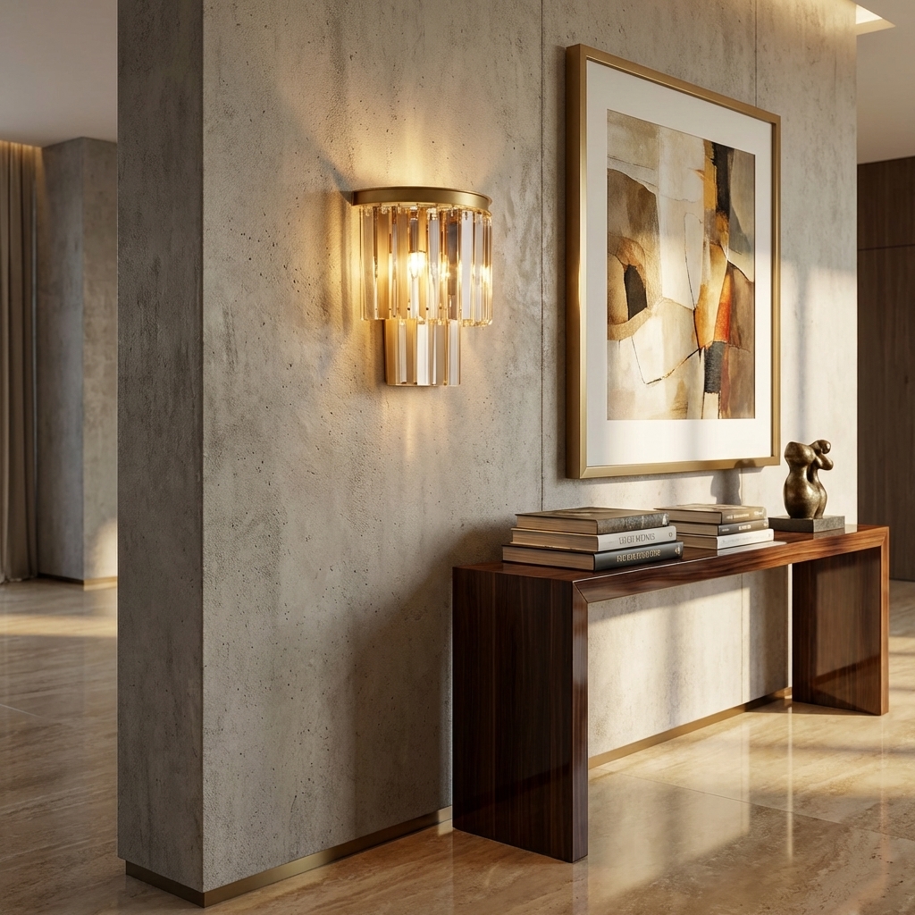 Ideal for hallways, bedrooms, dining spaces, and elevated hospitality interiors, the Prismatique Multi-Tier Crystal Wall Sconce adds sculptural brilliance and timeless Art Deco character to the wall.
