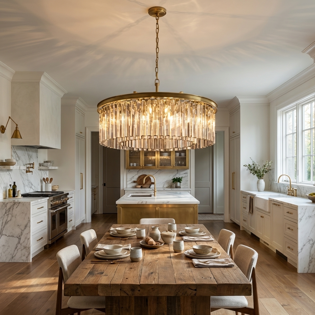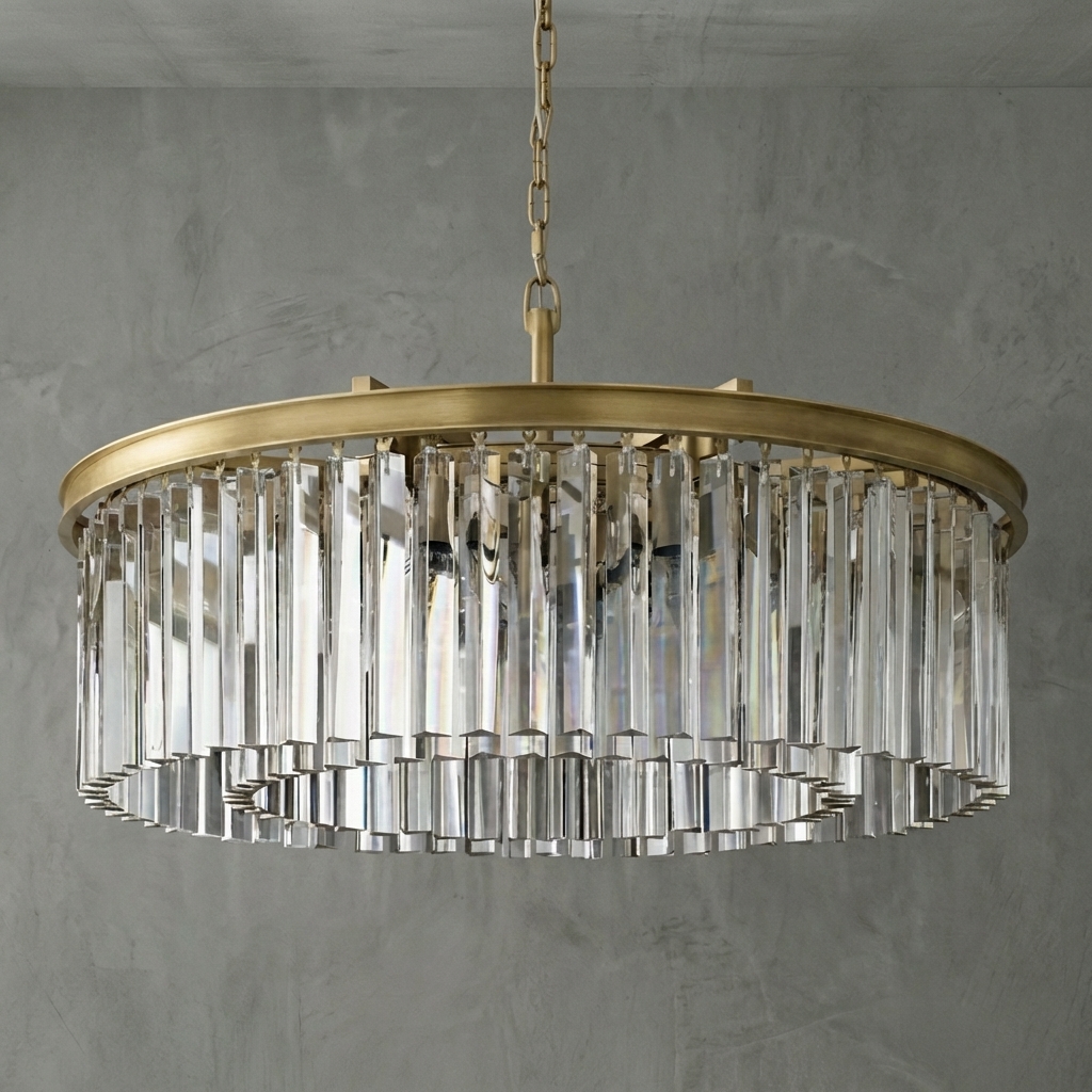 With its faceted crystal construction and strong brass-framed geometry, the Prismatique Round Chandelier 32" is ideal for interiors seeking a statement piece with both brilliance and structure.