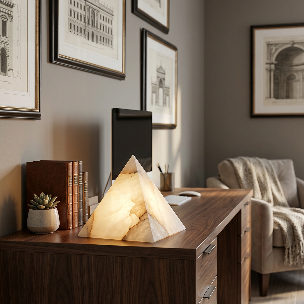 Designed with a strong architectural sensibility, the Pyramid Alabaster Table Lamp presents alabaster as a precise structural material. Its disciplined, contemporary silhouette feels sculptural yet understated, bringing a sense of refined order to any space. As the lamp glows, illumination moves through the stone in measured gradients, revealing the alabaster's layered veining with a soft, balanced radiance. The result is a quietly luxurious presence that pairs beautifully with clean-lined dining rooms, transitional hallways, and elevated interiors where refined structure meets gently diffused light.