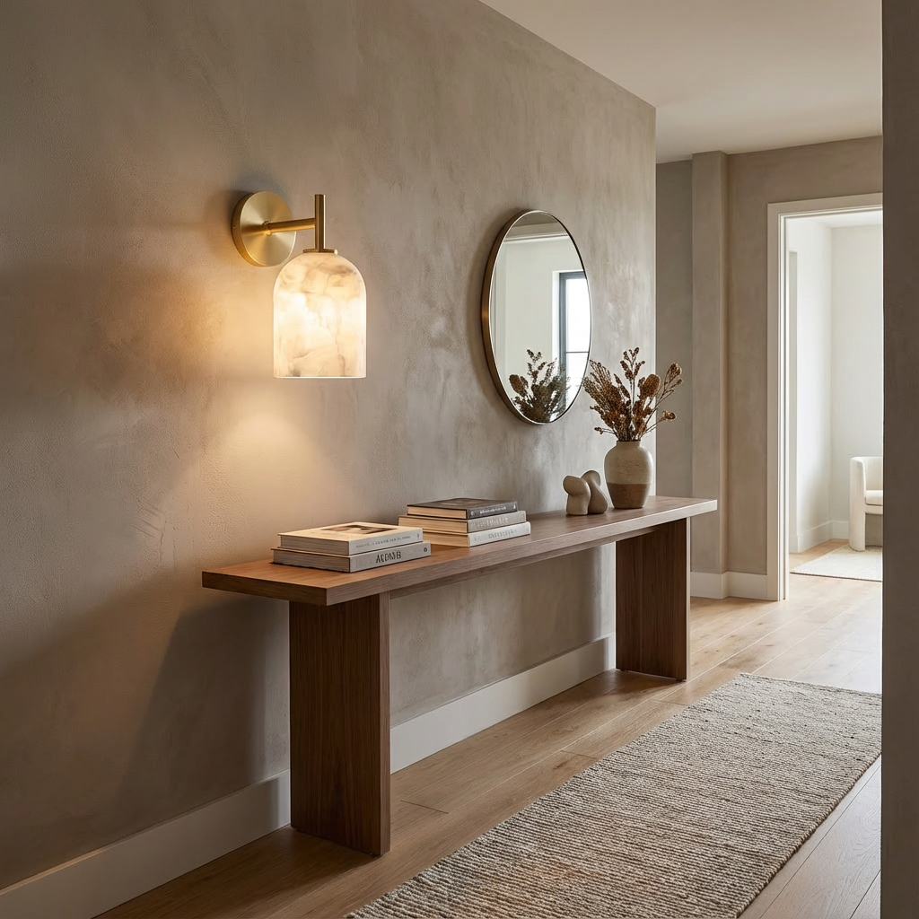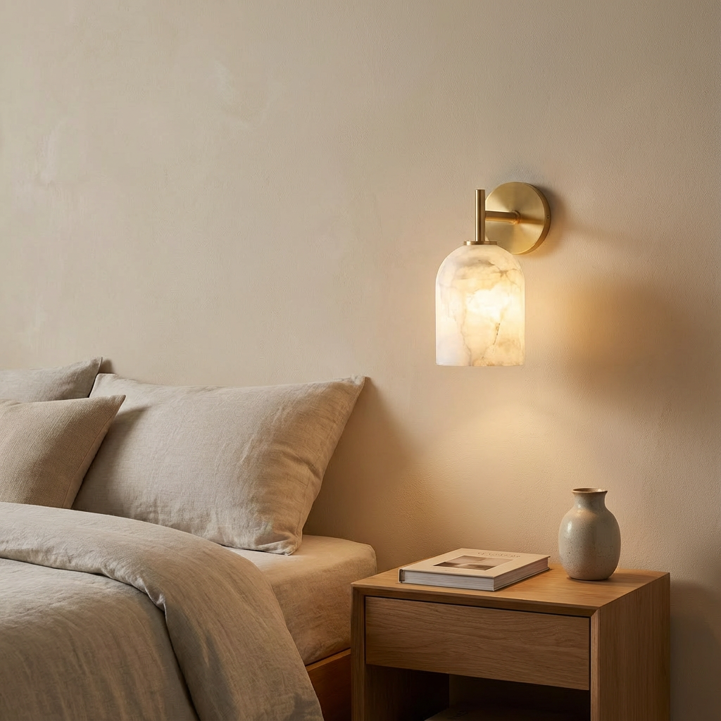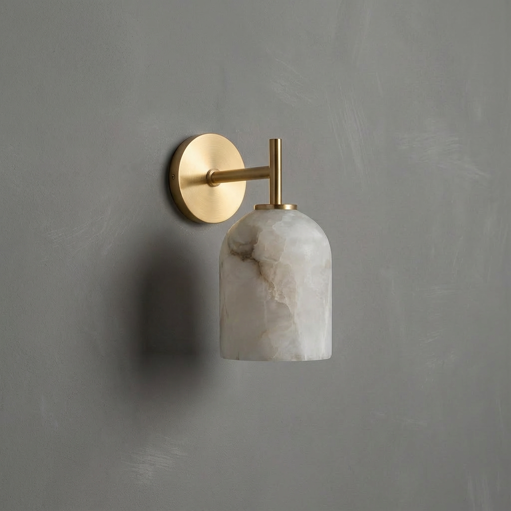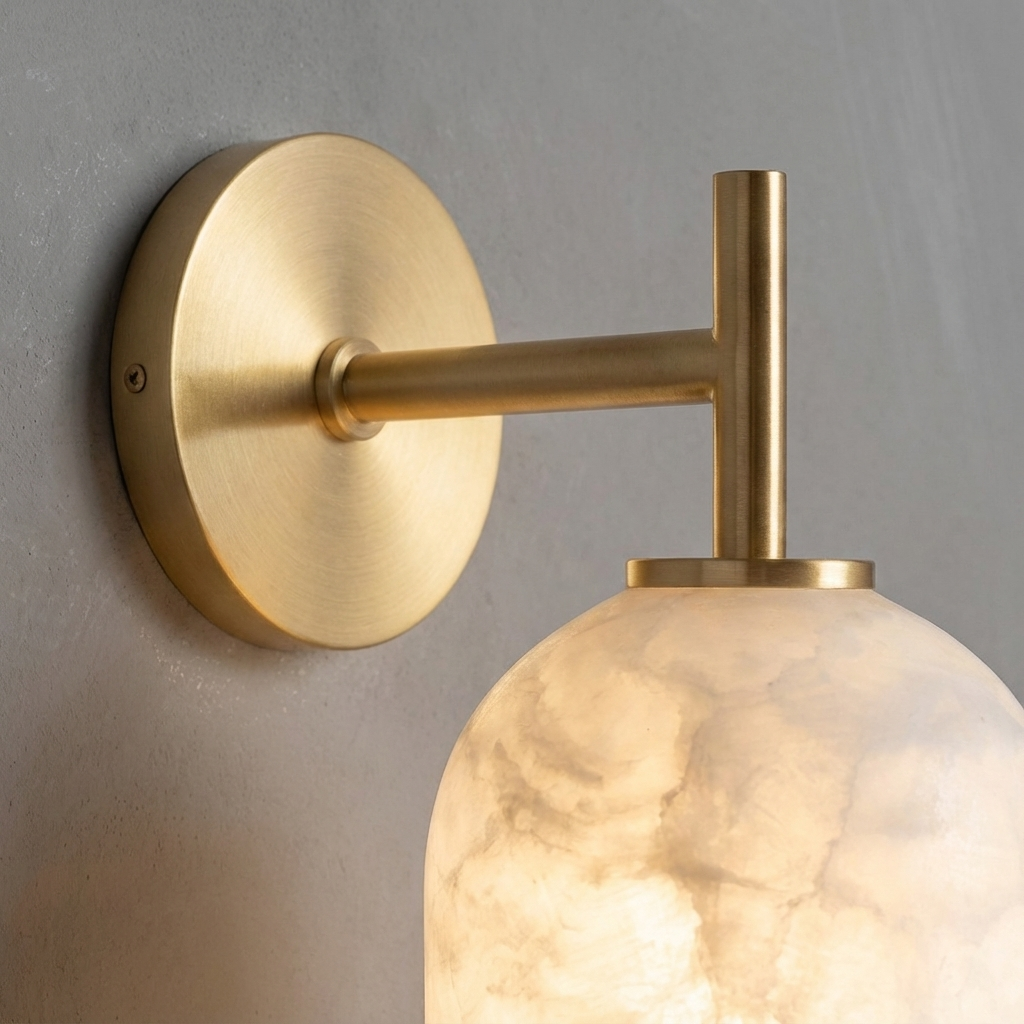 Introducing the Rae Alabaster Wall Lamp, where sculptural form meets quietly luxurious light. Soft illumination gathers at the center of the alabaster stone, then diffuses outward in gentle tonal shifts, casting a warm, welcoming glow. Once lit, the natural alabaster reveals its feathered marbling, bringing depth, texture, and a sense of intimacy to any space. The stone's organic character makes each lamp feel uniquely personal and beautifully suited to quiet reading corners, warm transitional zones, and interiors that celebrate tactile, natural materials. Thoughtfully designed and elegantly understated, the Rae Alabaster Wall Lamp adds a refined, modern presence while keeping the focus on the subtle beauty of alabaster itself.