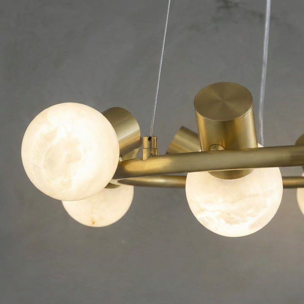 Introducing the Alabaster Raechelle Chandelier Series - a modern statement in sculptural illumination. This chandelier leans into alabaster's natural ability to glow with layered depth, creating a soft, luminous presence that feels both refined and inviting. Delicate veining appears like faint traces of ink beneath the surface, giving each alabaster diffuser its own calm, organic complexity. The result is a piece that feels artful and quietly luxurious, perfect for spaces where light is meant to be seen as much as it is felt. Ideal for curated lounges, long hallways, or architectural nooks, the Raechelle Chandelier transforms any setting into a thoughtfully illuminated environment, where every glow and shadow adds to the overall composition.